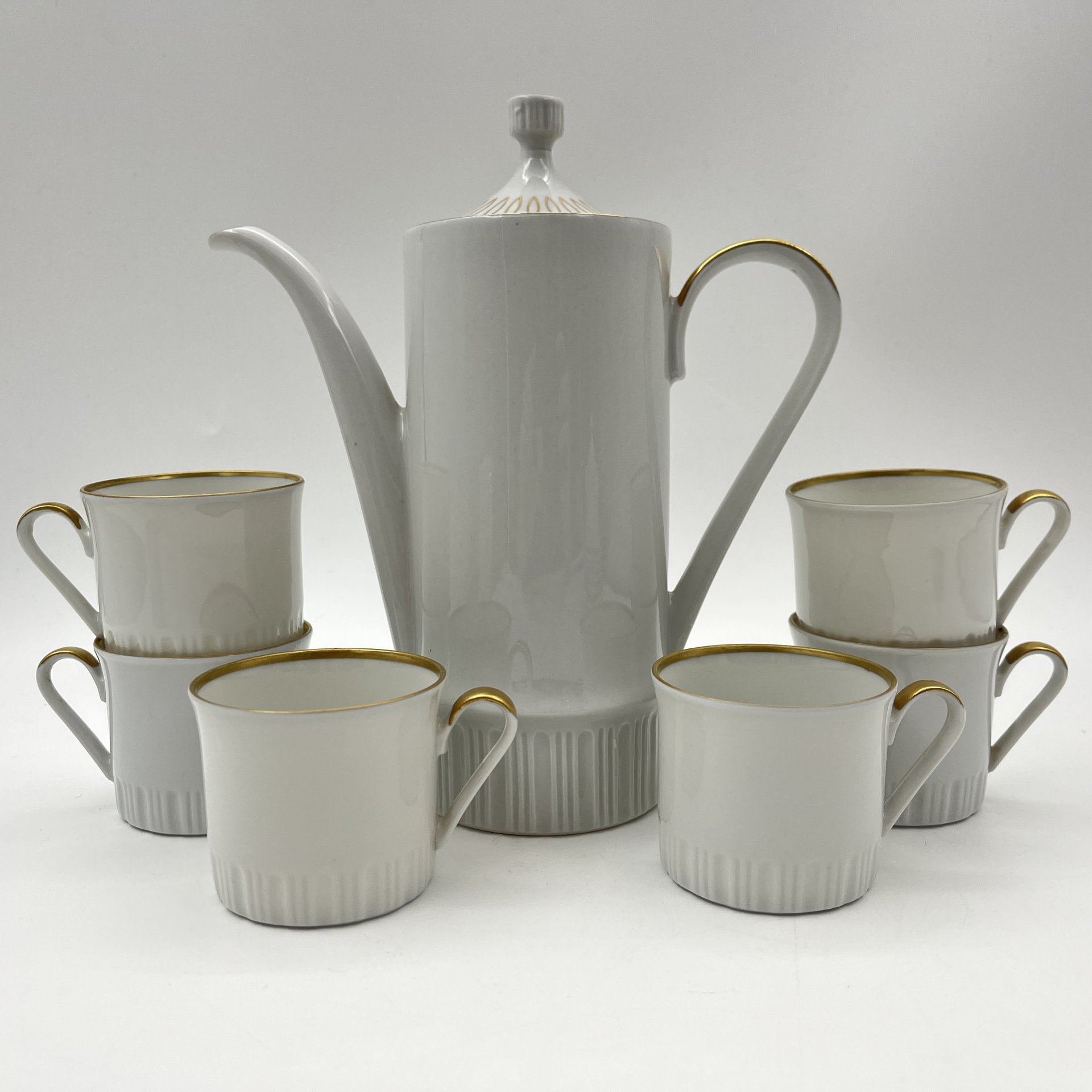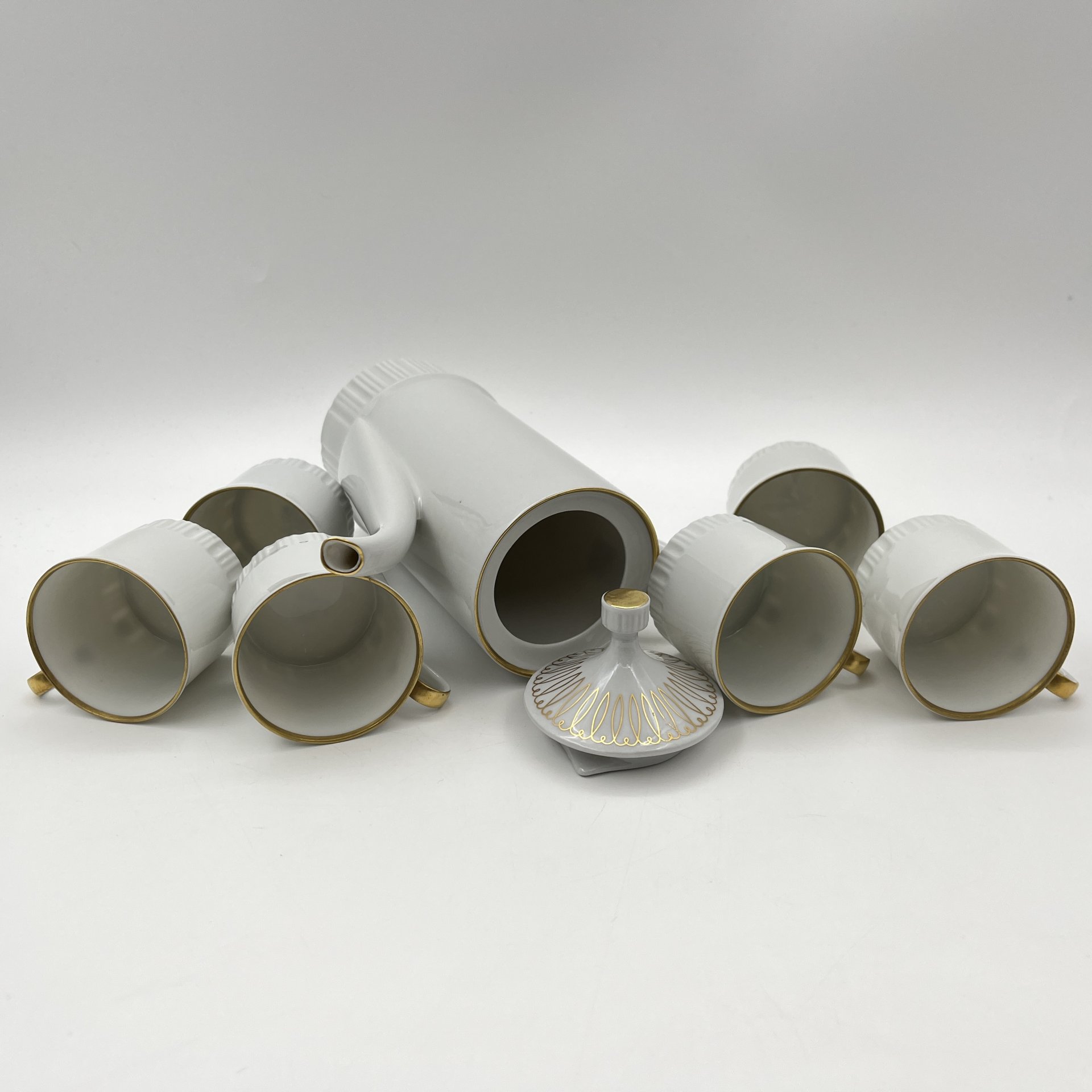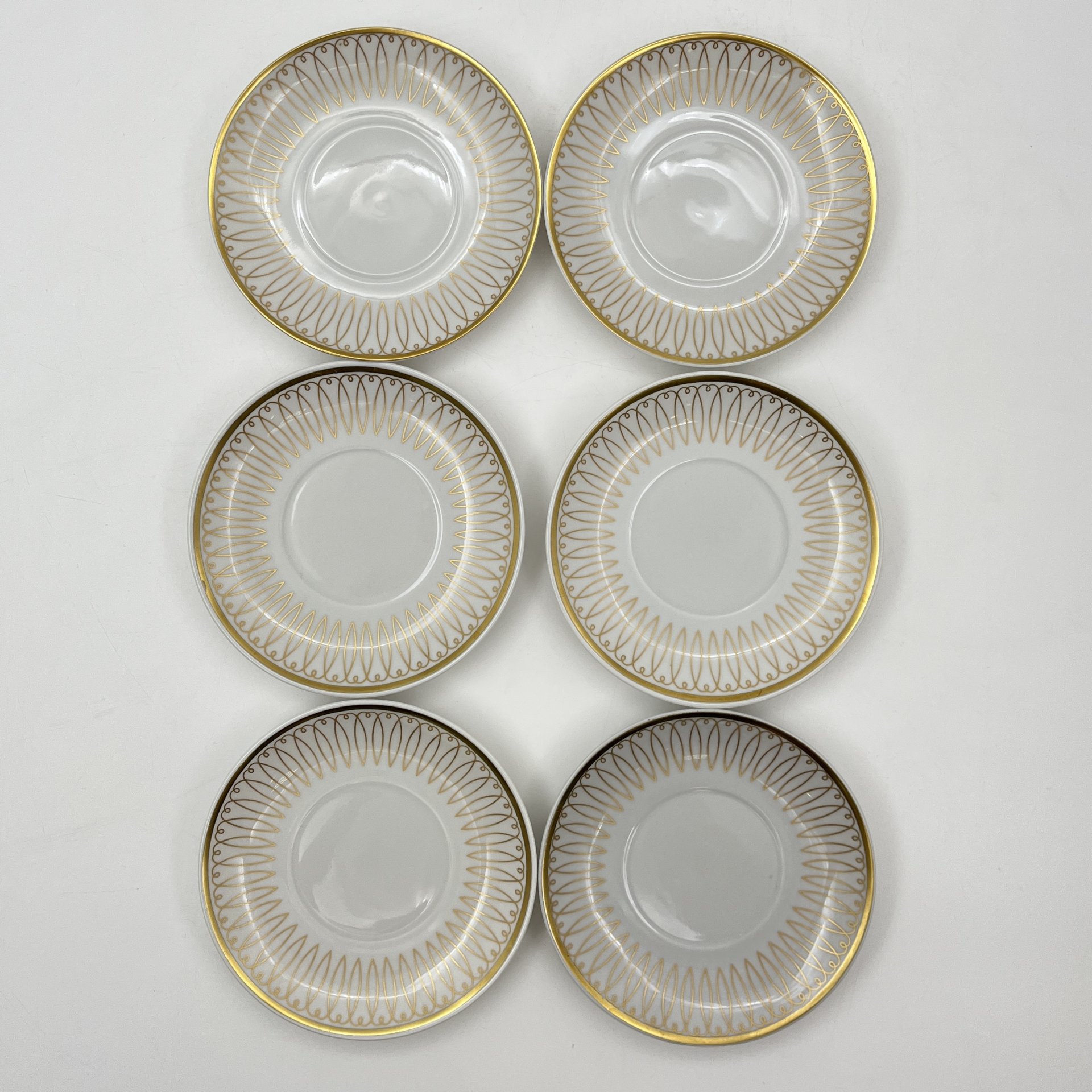 Купить Набор для подачи кофе и чая на три персоны (10 предметов), украшенный лаконичным декором, фарфор, золочение, Дулевский фарфоровый завод (Дулёво), СССР, 1987 г.