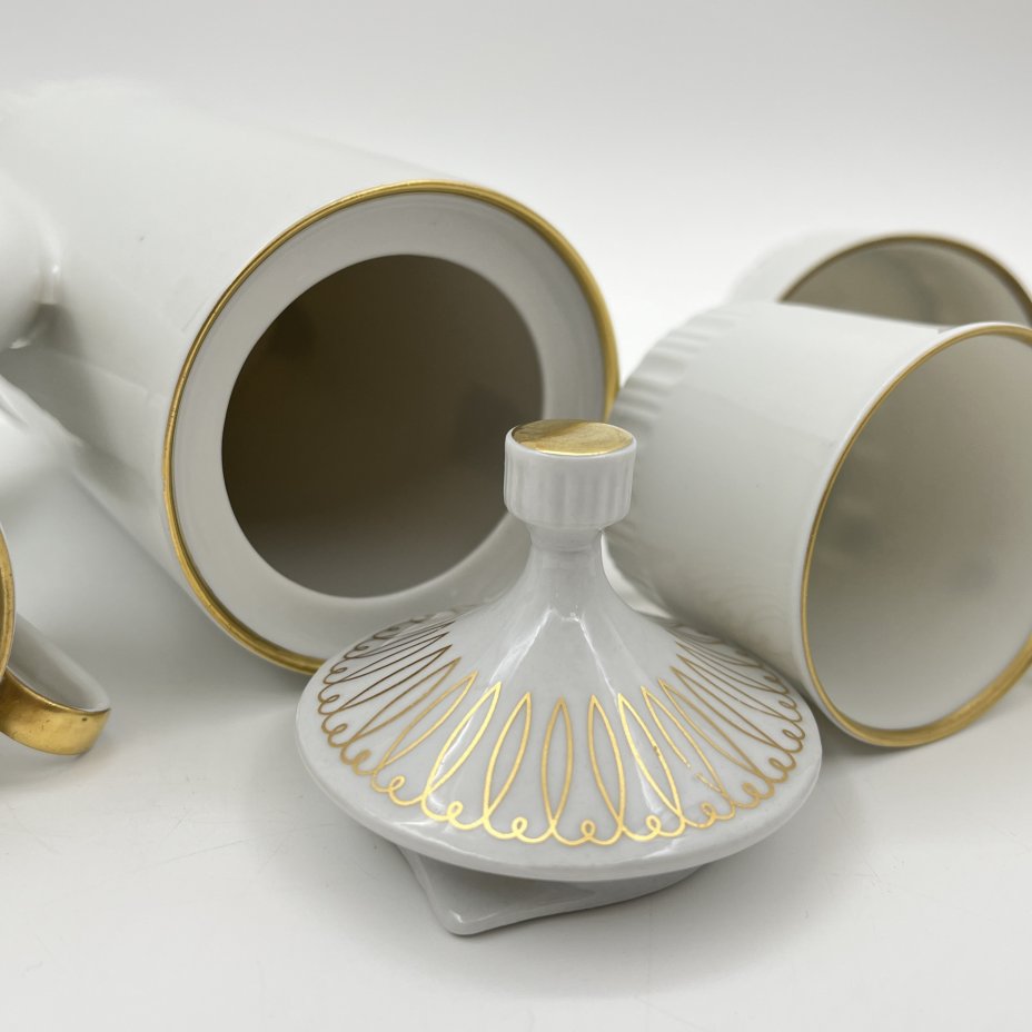 Набор для подачи кофе и чая на три персоны (10 предметов), украшенный лаконичным декором, фарфор, золочение, Дулевский фарфоровый завод (Дулёво), СССР, 1987 г.