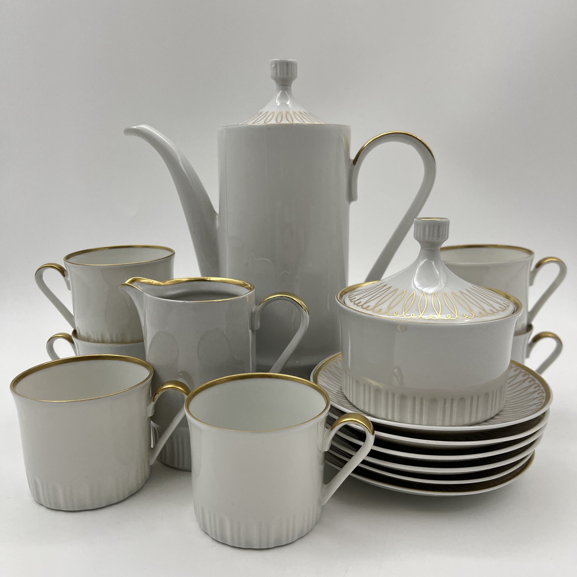 Сервиз кофейный "Галантная сцена" на 6 персон (15 предметов), фарфор, деколь, люстр, золочение, Западная Европа, 1970-1990 гг.