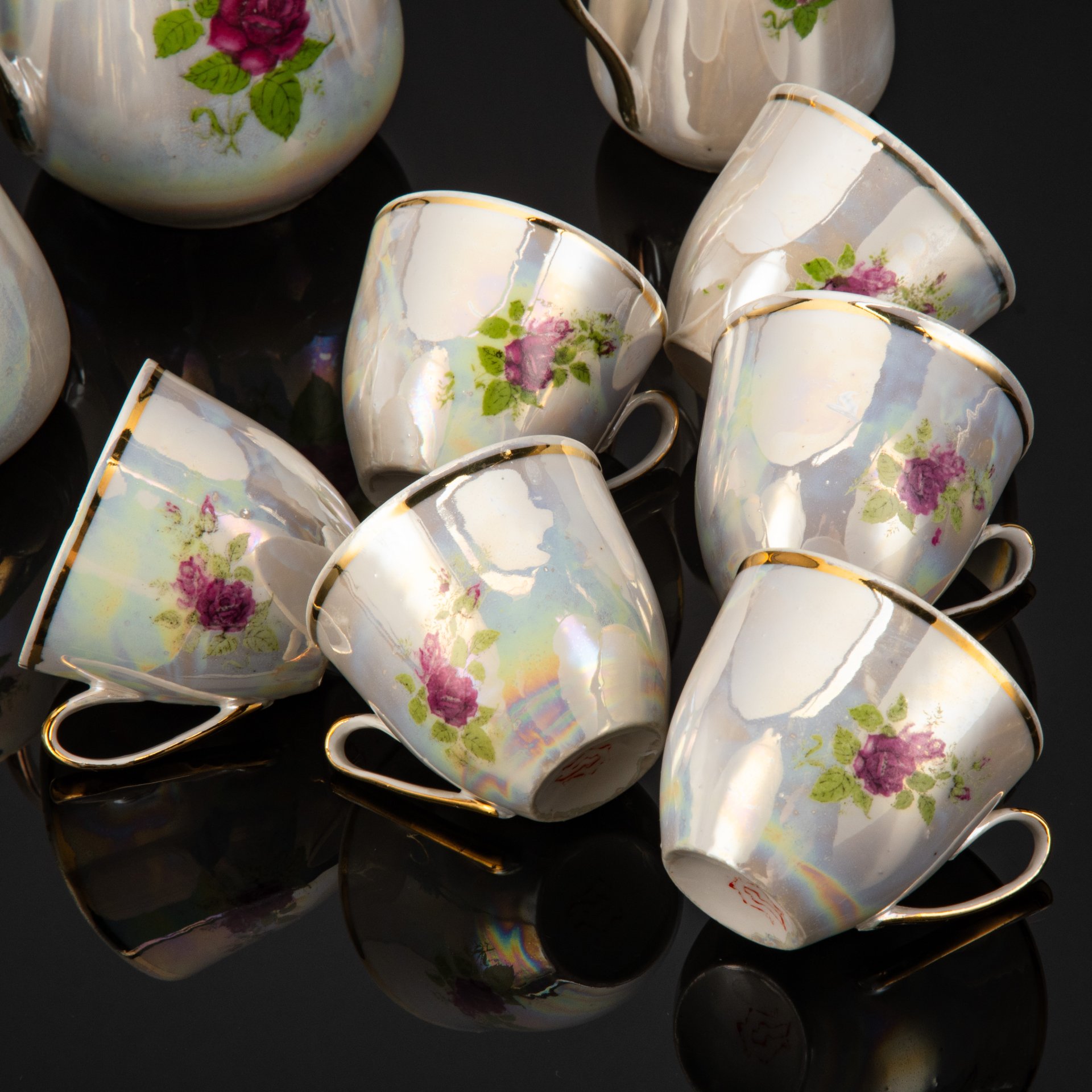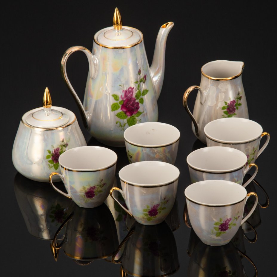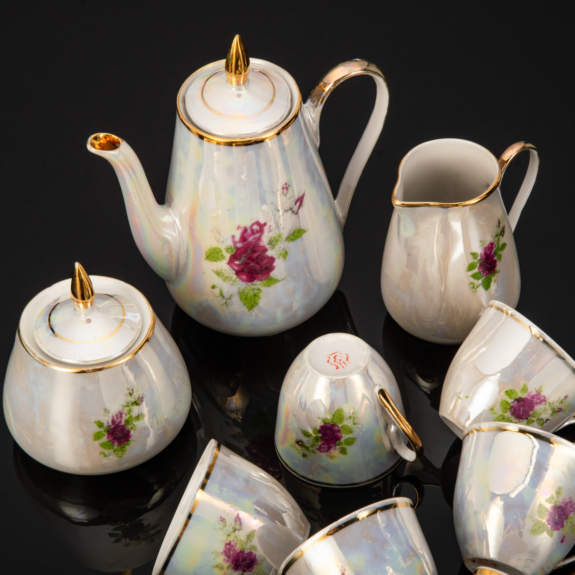 Сервиз кофейный с цветочным декором на 6 персон (13 предметов), фарфор, деколь, крытье, золочение, Дулевский фарфоровый завод (Дулёво), Россия, 1999 г.