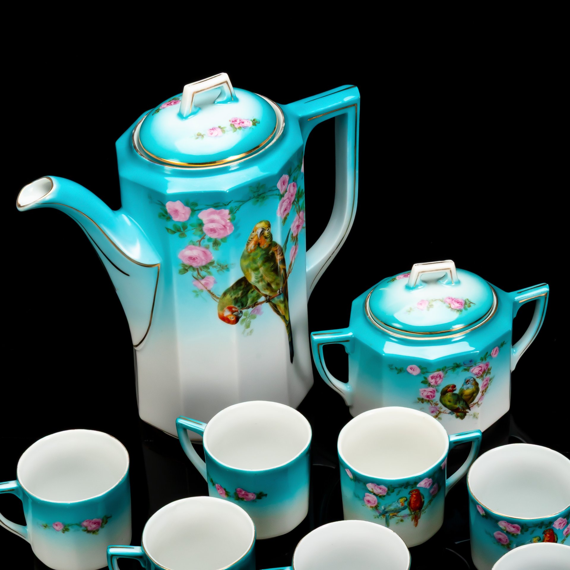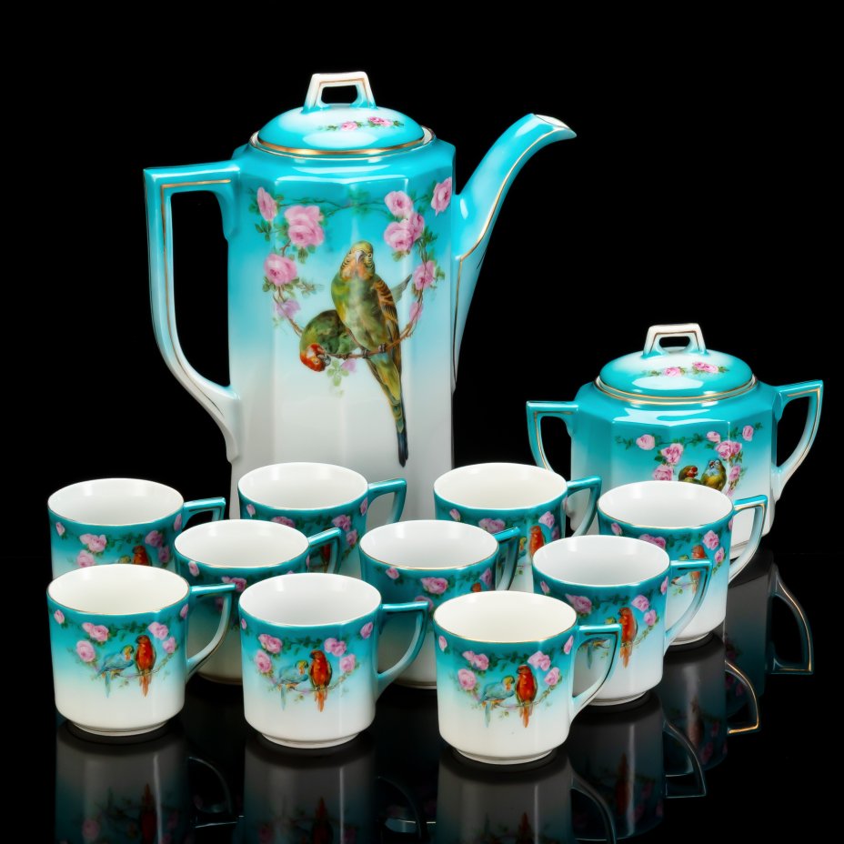 Сервиз кофейный "Галантная сцена" на 6 персон (15 предметов), фарфор, деколь, люстр, золочение, Западная Европа, 1970-1990 гг.