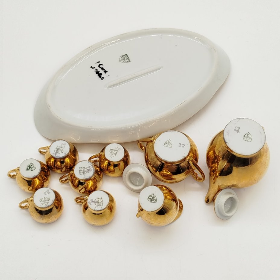 Сервиз чайный с декором в виде разводов в песочно-золотистой гамме на 5 персон (13 предметов), фарфор, люстр, золочение, Walbrzych, Польша, 1952-1992 гг.