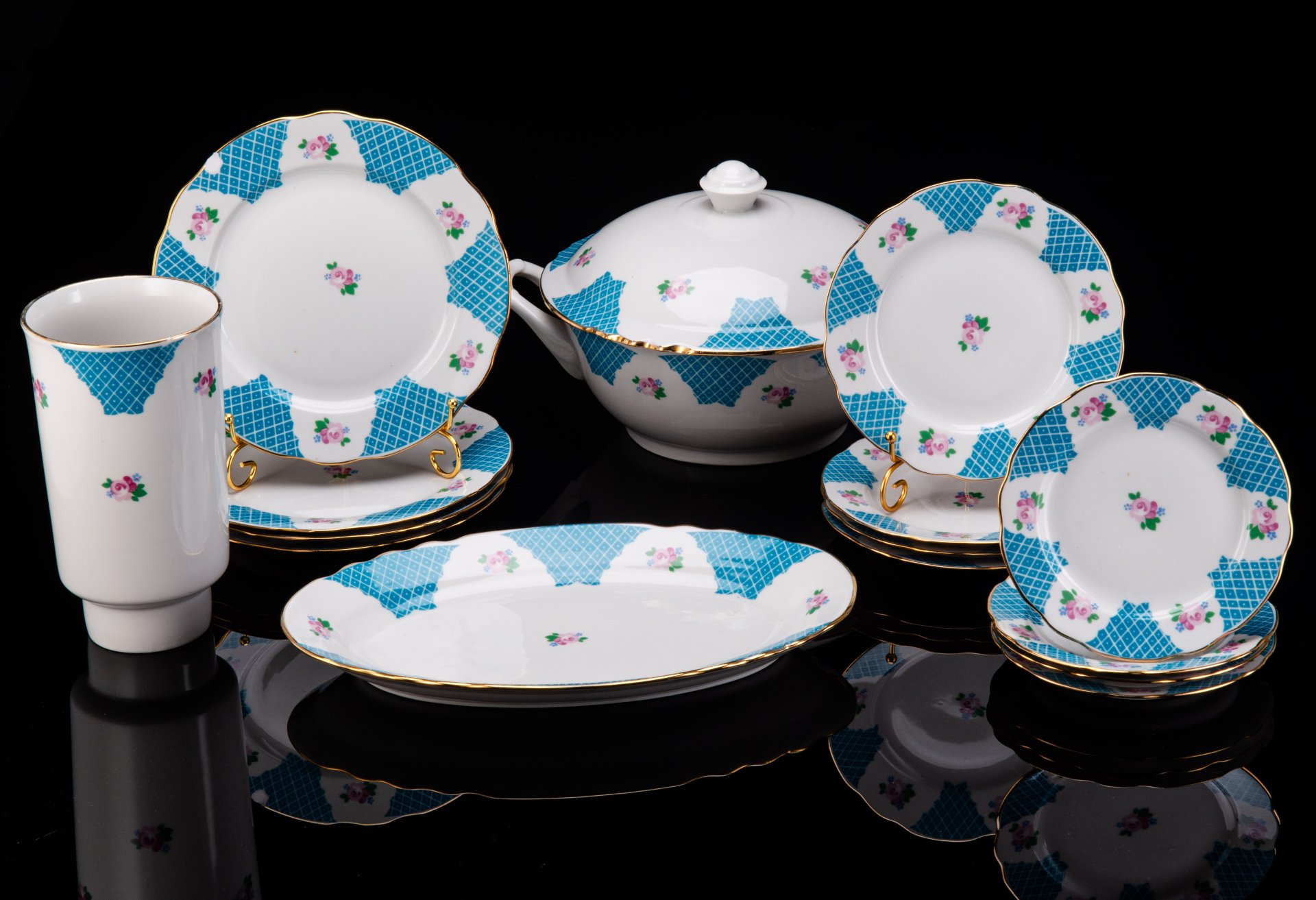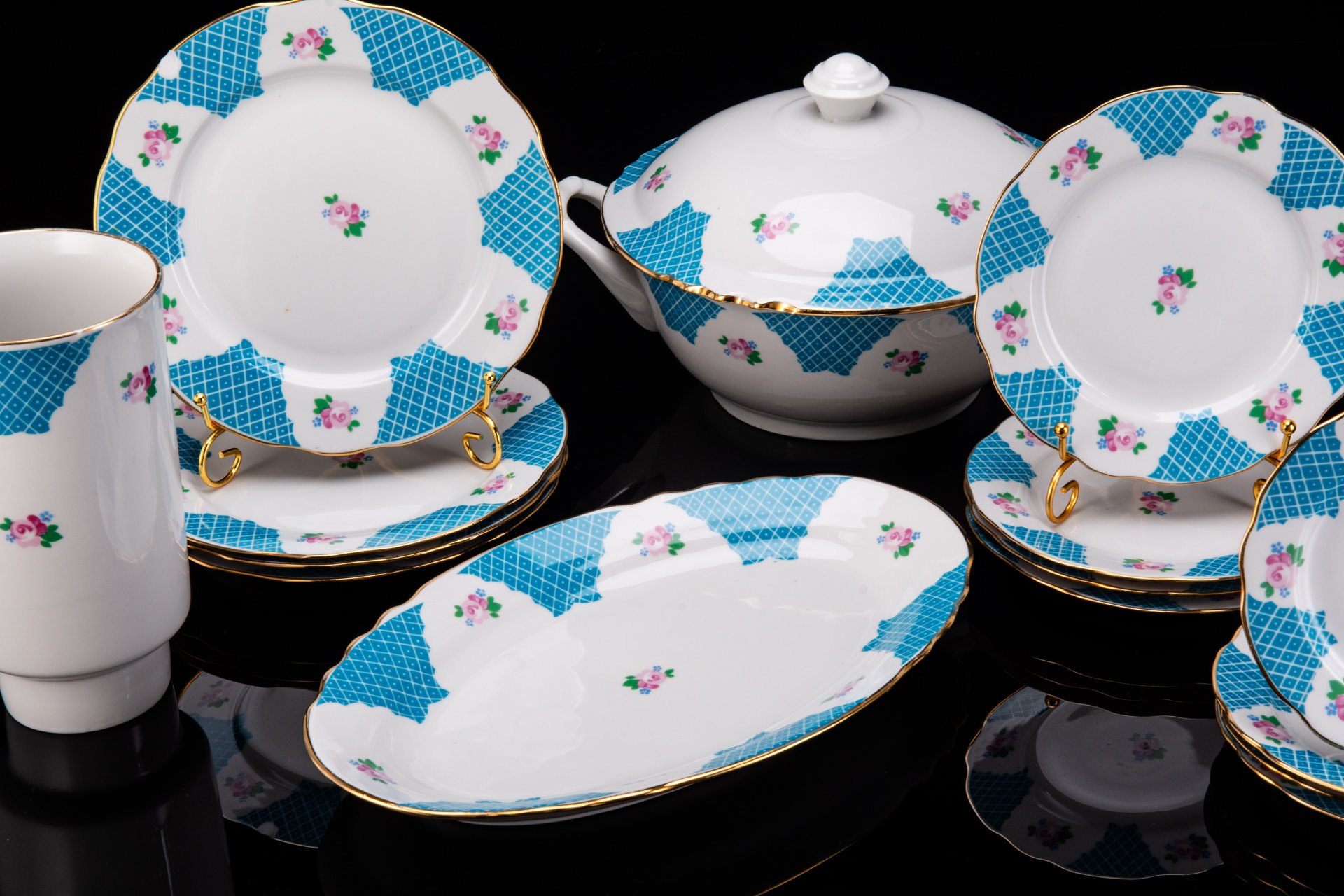 Сервиз столовый (обеденный) на 6 персон из серии "Pompadour 2" (19 предметов), украшенный растительным орнаментом на кобальтовом фоне, фарфор, крытье, деколь, золочение, Zsolnay, Венгрия, 1980-2000 гг.