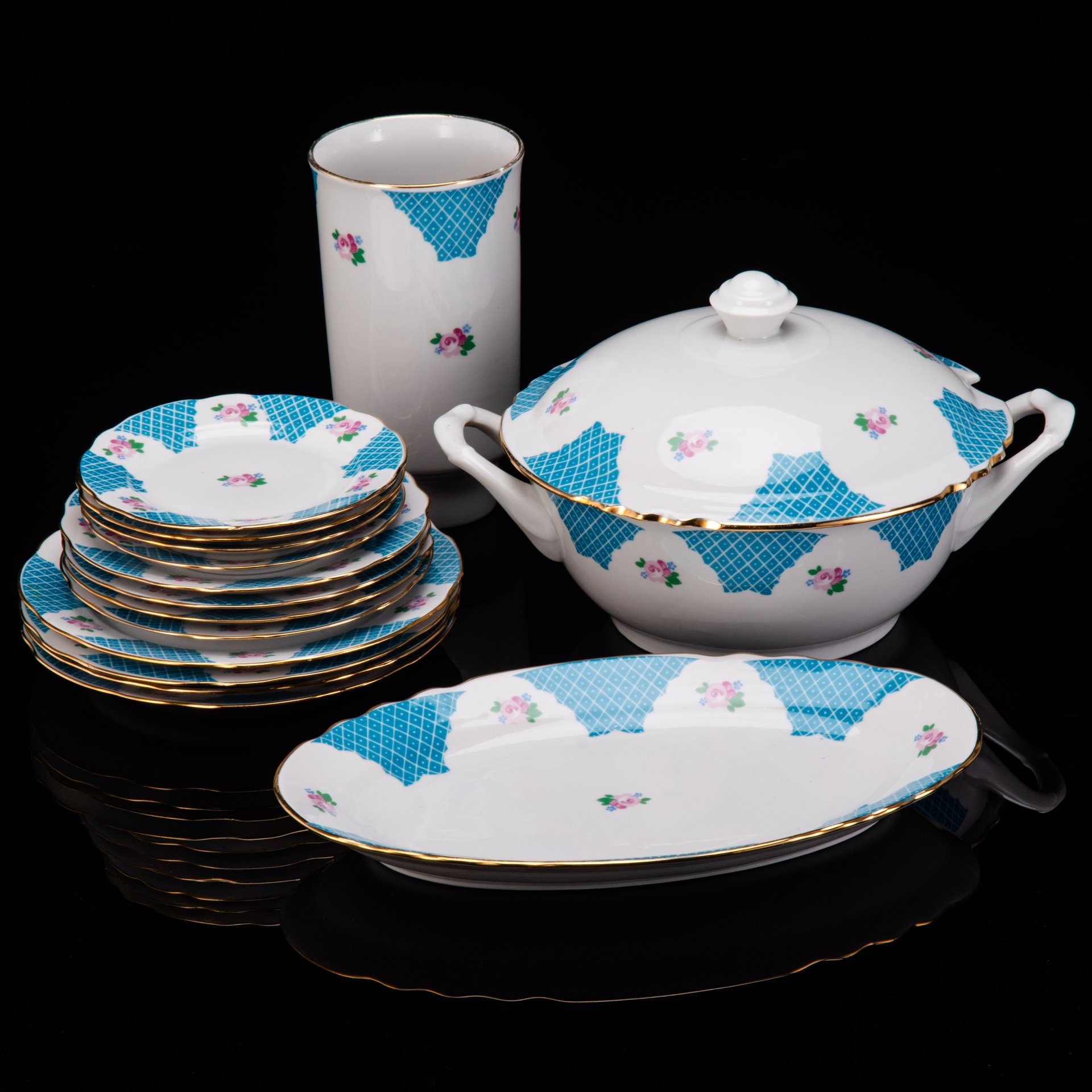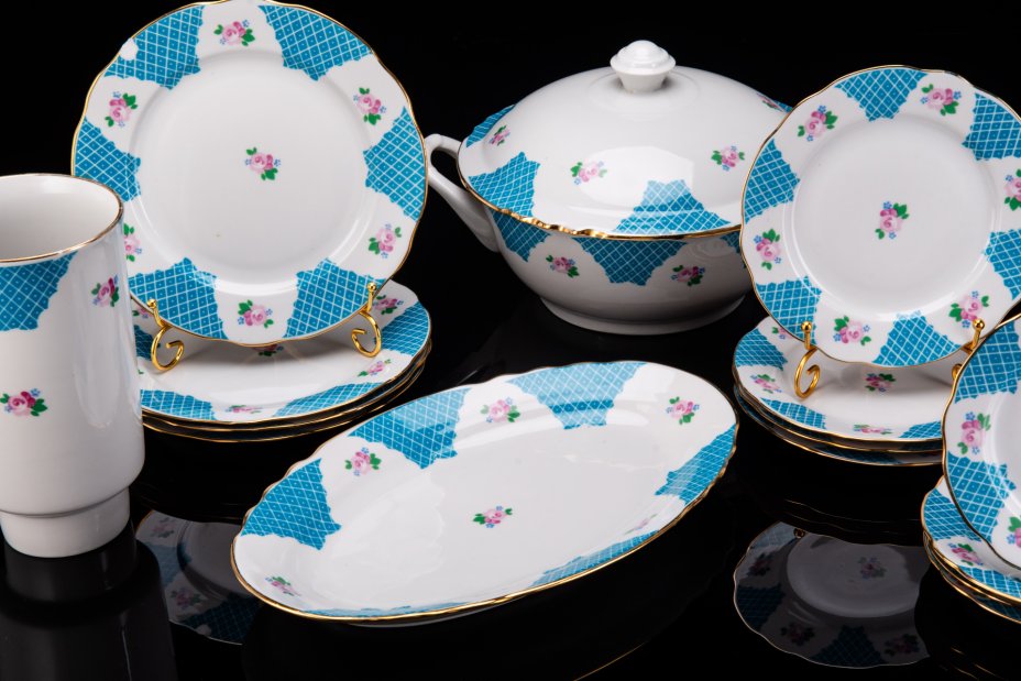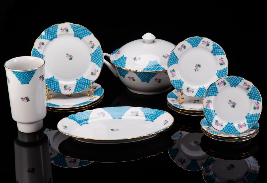Набор обеденный с цветочным декором на 3 персоны (13 предметов), фарфор, деколь, золочение, Дулевский фарфоровый завод (Дулёво), СССР, 1968-1991 гг.