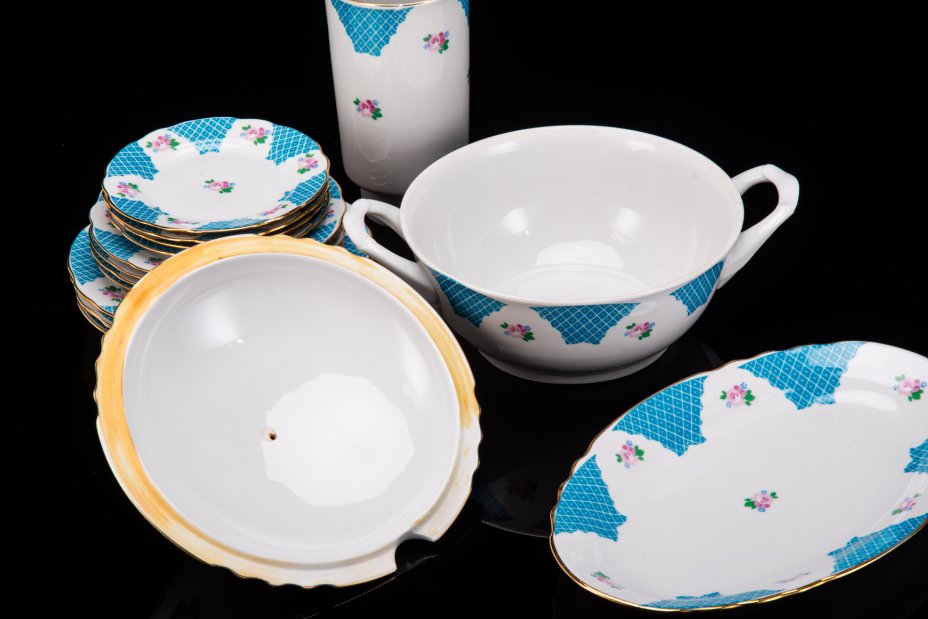Набор столовый с орнаментом в виде шашечек вдоль борта, 10 предметов, фарфор, деколь, Heinrich & Co., Германия, 1911-1930 гг.