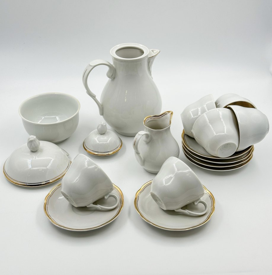 Сервиз кофейный на 6 персон, украшенный линейным орнаментом (15 предметов), фарфор, золочение, Kahla, ГДР, 1970-1980 гг.