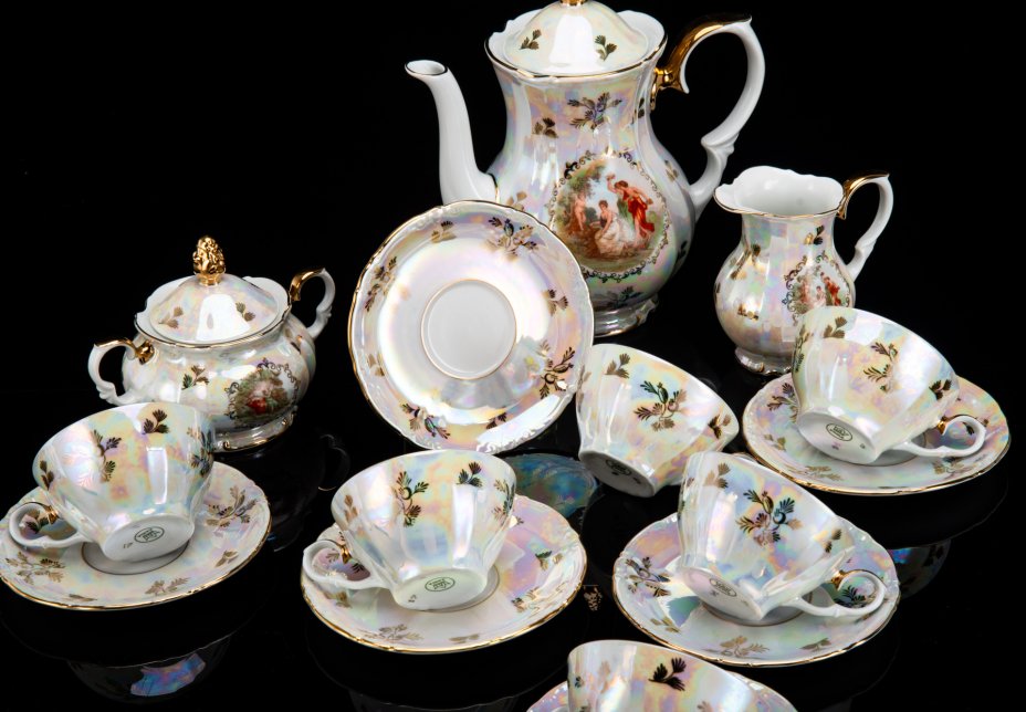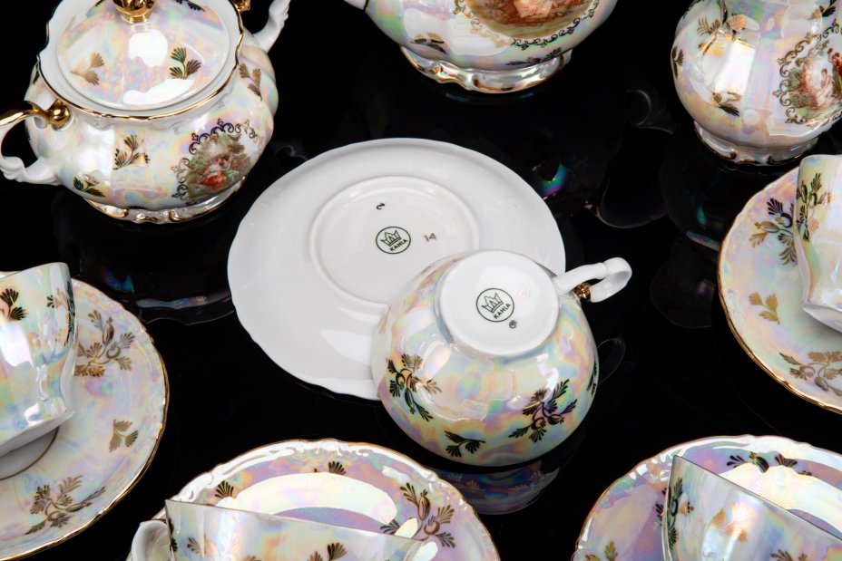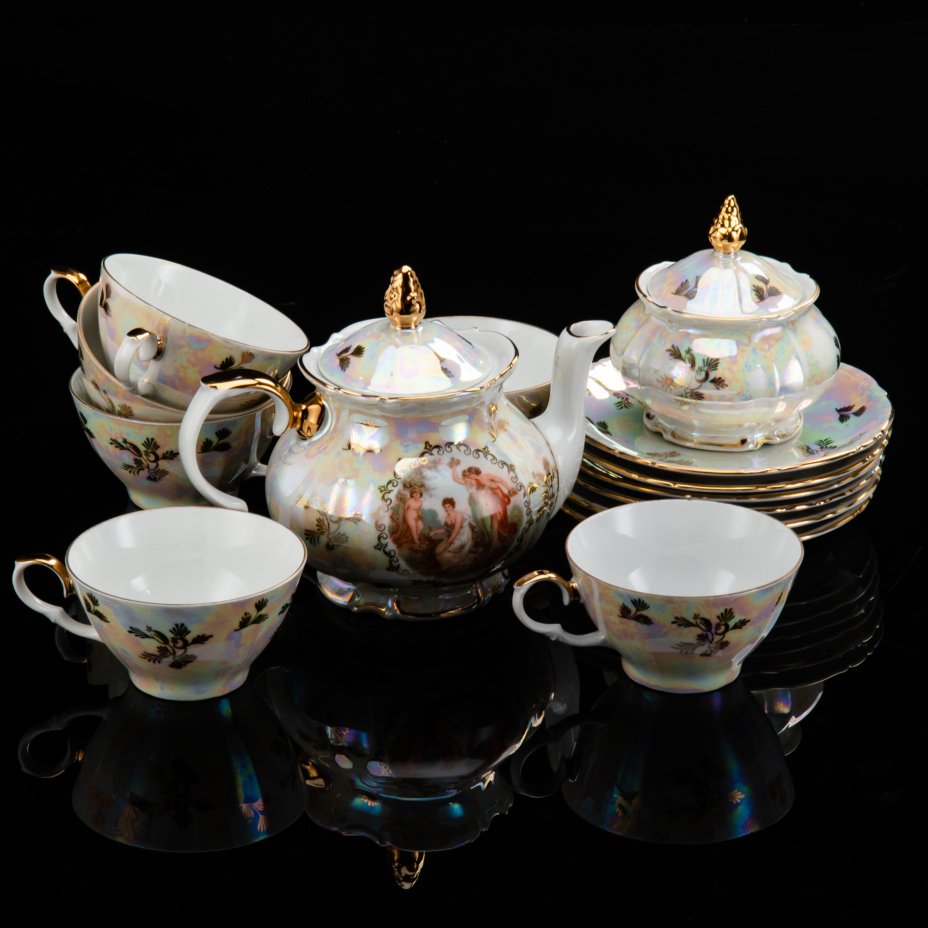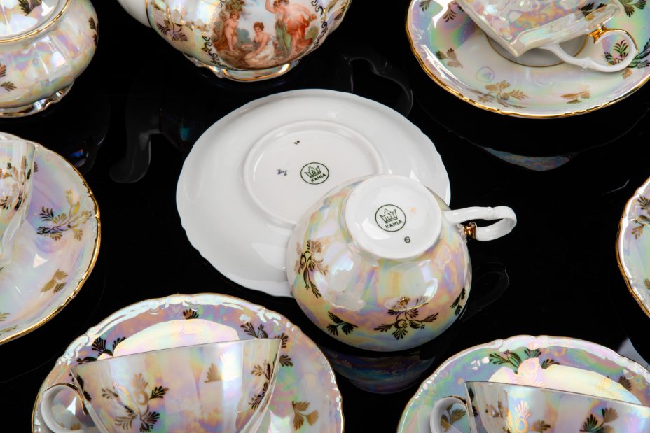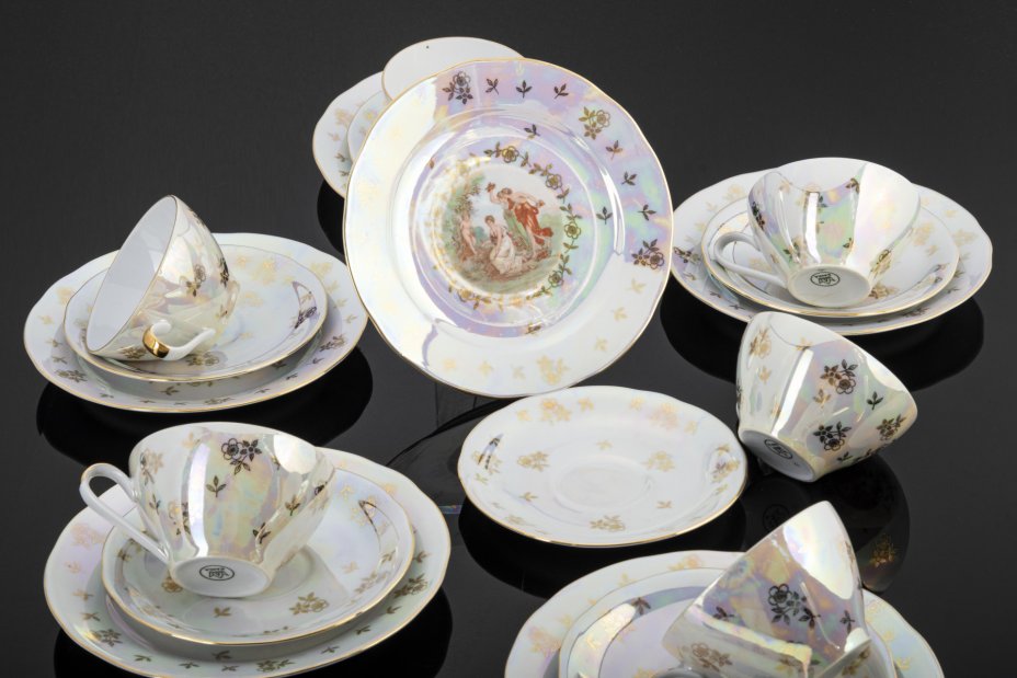 Сервиз чайный на 6 персон (14 предметов) "Мадонна", фарфор, деколь, люстр, золочение, Kahla, ГДР, 1960-1980 гг.