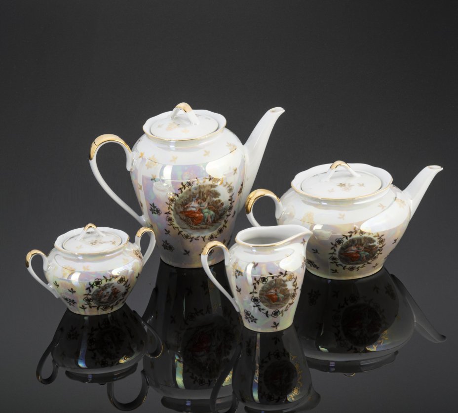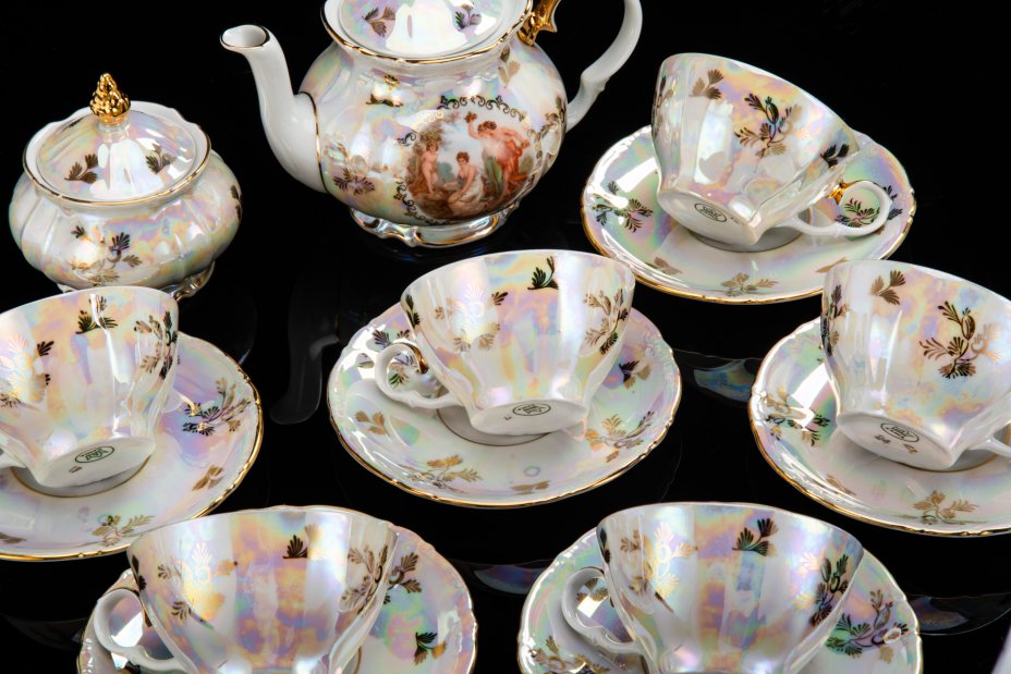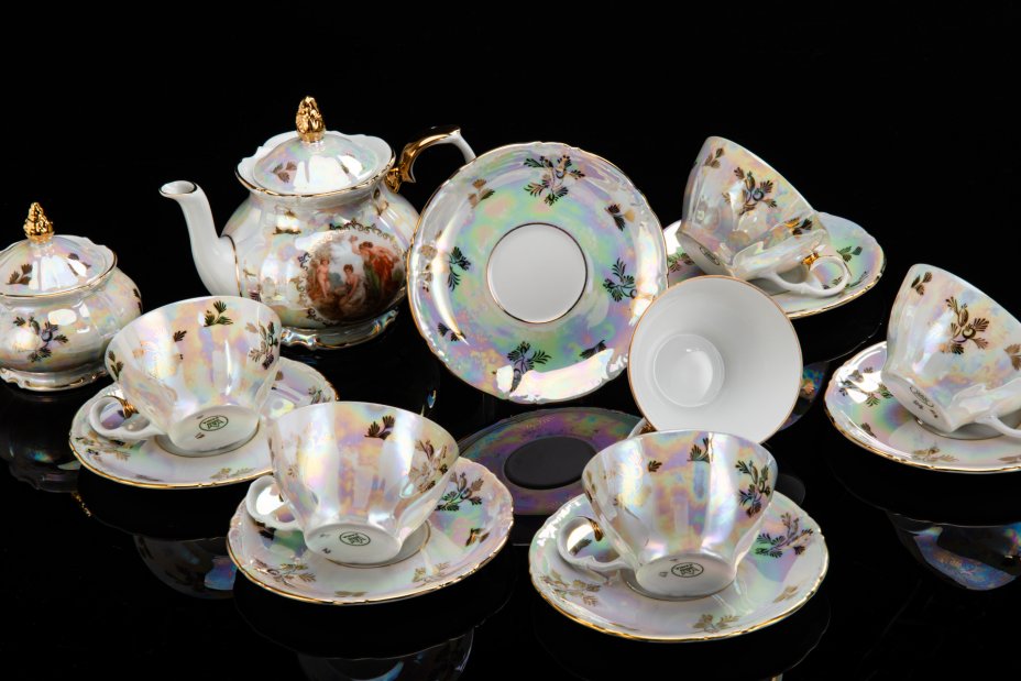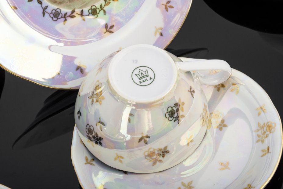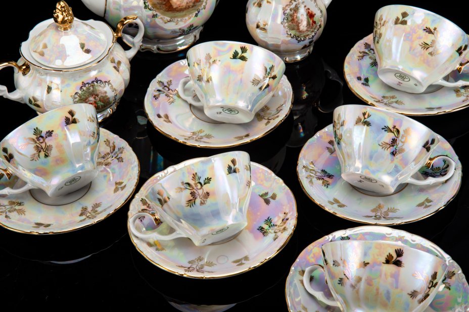 Сервиз чайный на 6 персон (14 предметов) "Мадонна", фарфор, деколь, люстр, золочение, Kahla, ГДР, 1960-1980 гг.