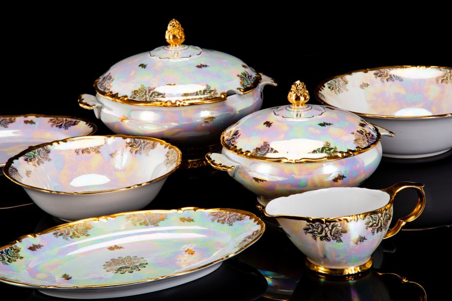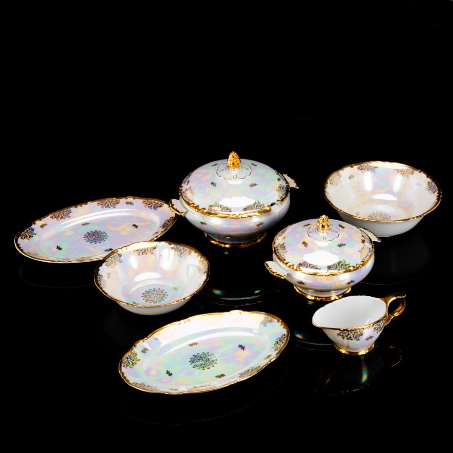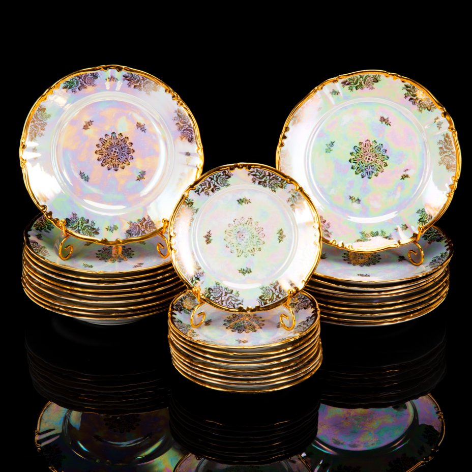 Сервиз обеденный на 10 персон с цветочным декором (37 предметов), фарфор, люстр, золочение, Kahla, ГДР, 1960-1980 гг.