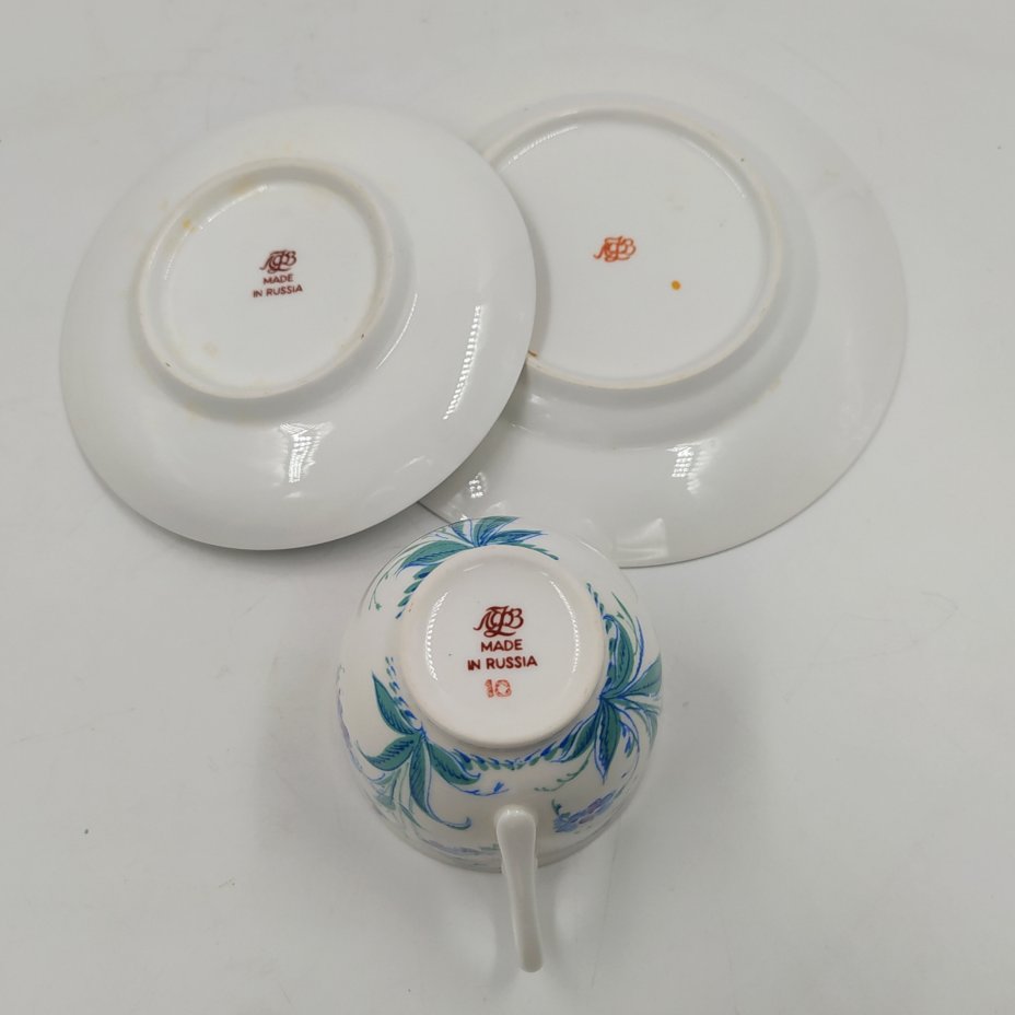 Набор чайных пар на 3 персоны с цветочным декором, фарфор, крытье кобальтом, золочение, Ленинградский фарфоровый завод (ЛФЗ), СССР, 1970-1991 гг.
