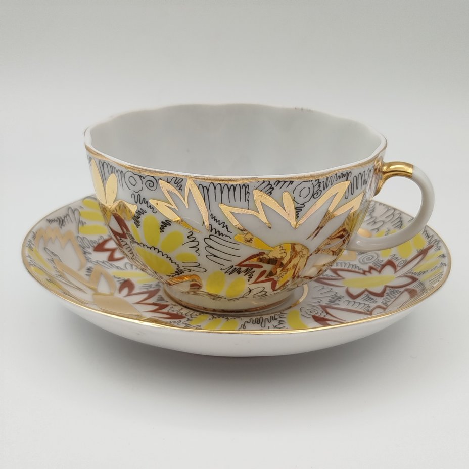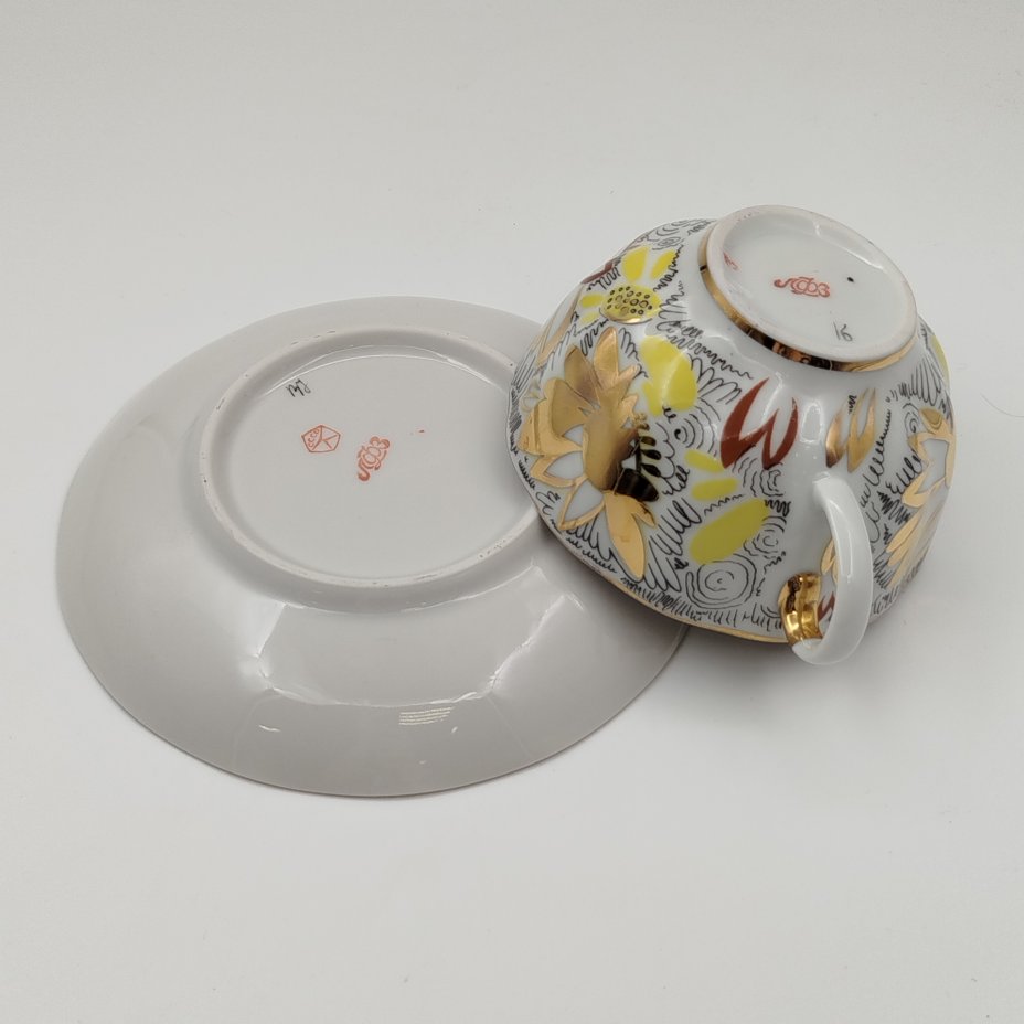 Пара чайная "Золотые ромашки", автор росписи Л.И. Григорьева, форма "Тюльпан", фарфор, деколь, золочение, Ленинградский фарфоровый завод (ЛФЗ), СССР, 1970-1992 гг.