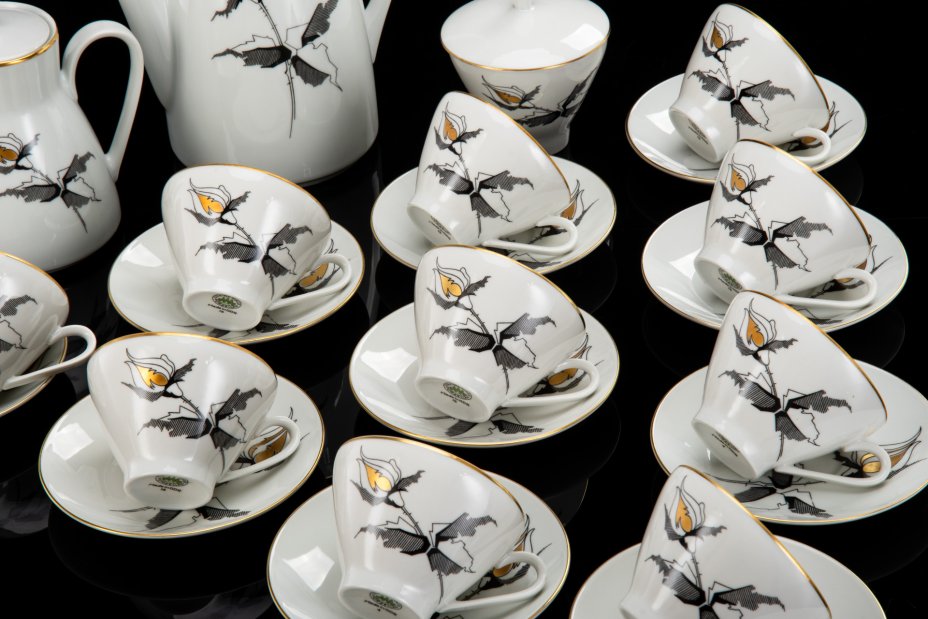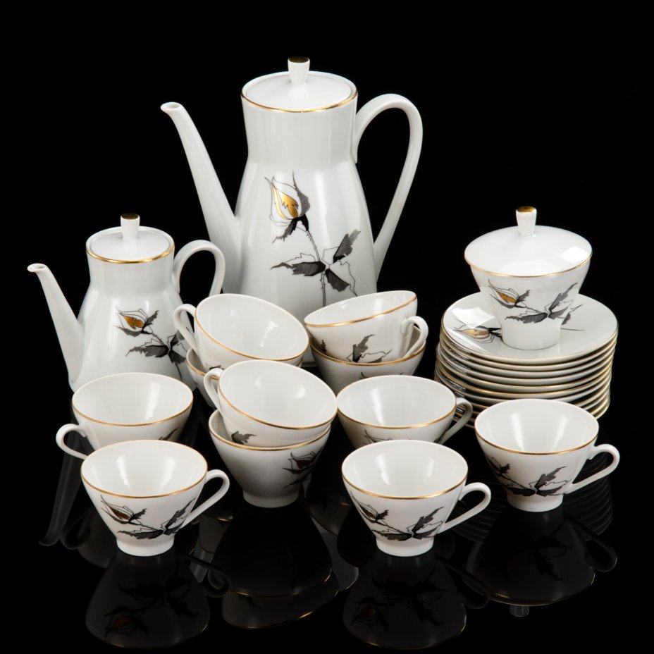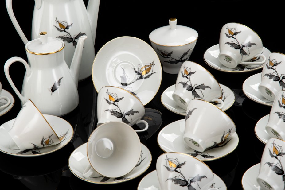 Сервиз чайно-кофейный "Черная роза" на 11 персон (25 предметов), фарфор, деколь, золочение, Freiberger Porzellan, ГДР, 1970-1990 гг.