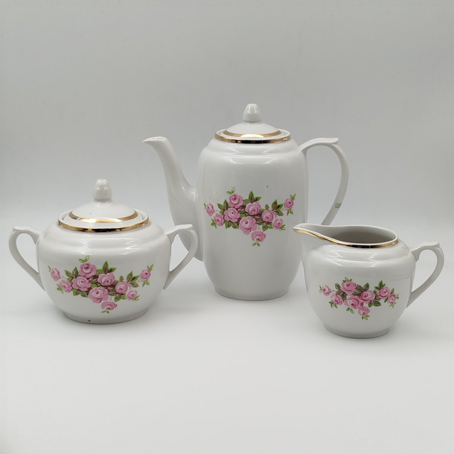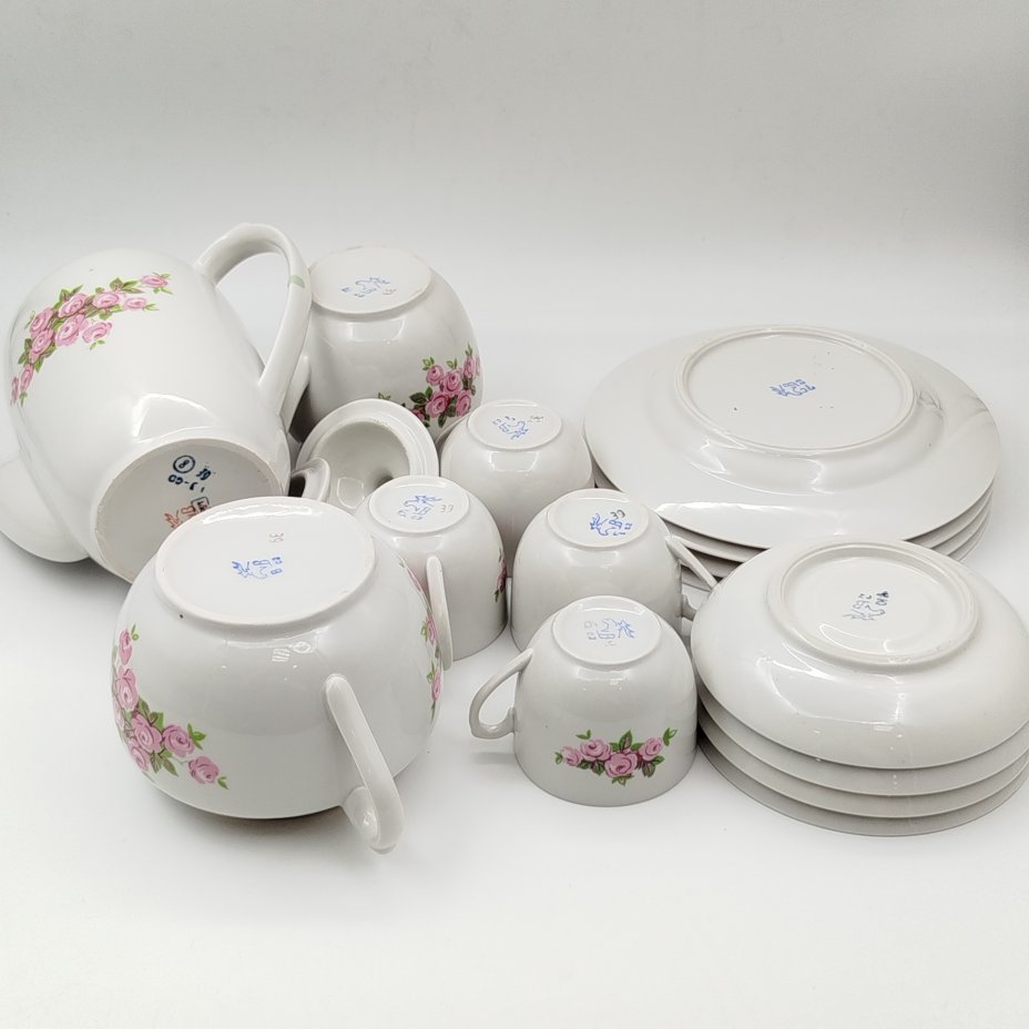 Сервиз чайный на 6 персон, украшенный декором в виде роз (21 предмет), фарфор, деколь, люстр, Дмитровский фарфоровый завод (ДФЗ Вербилки), СССР, 1980-1991 гг.