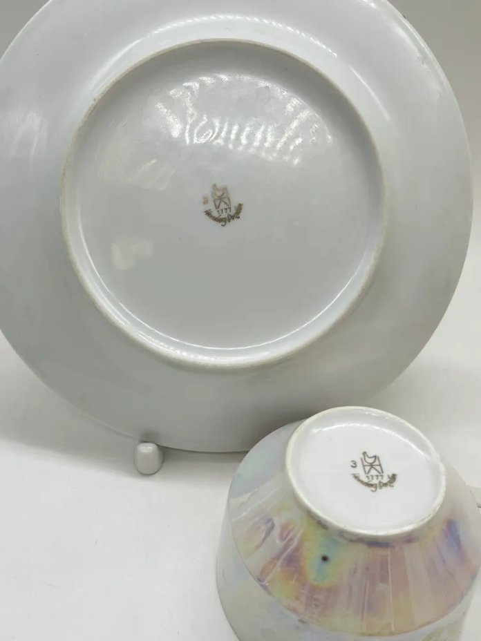 Набор из чашки и десертной тарелки с изображением античной сценки, фарфор, люстр, золочение, деколь, Graf Von Henneberg Porzellan, 1777 Jlmenau, Германия, 1950-1980 гг.