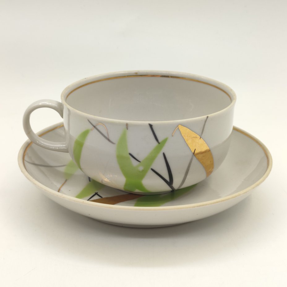 Чайная пара из сервиза «Ивушка», автор росписи Яснецов В., форма «Колечко» Гузанов А., фарфор, роспись, золочение, Дулевский фарфоровый завод (Дулёво), СССР, 1964 г.