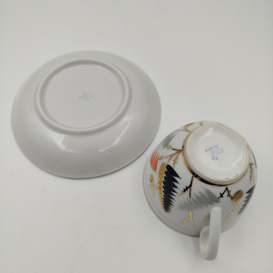 Пара чайная «Папоротник», форма "Весенняя" С.Е. Яковлевой, фарфор, роспись, золочение, цировка, Ленинградский фарфоровый завод (ЛФЗ), СССР, 1970-1992 гг.