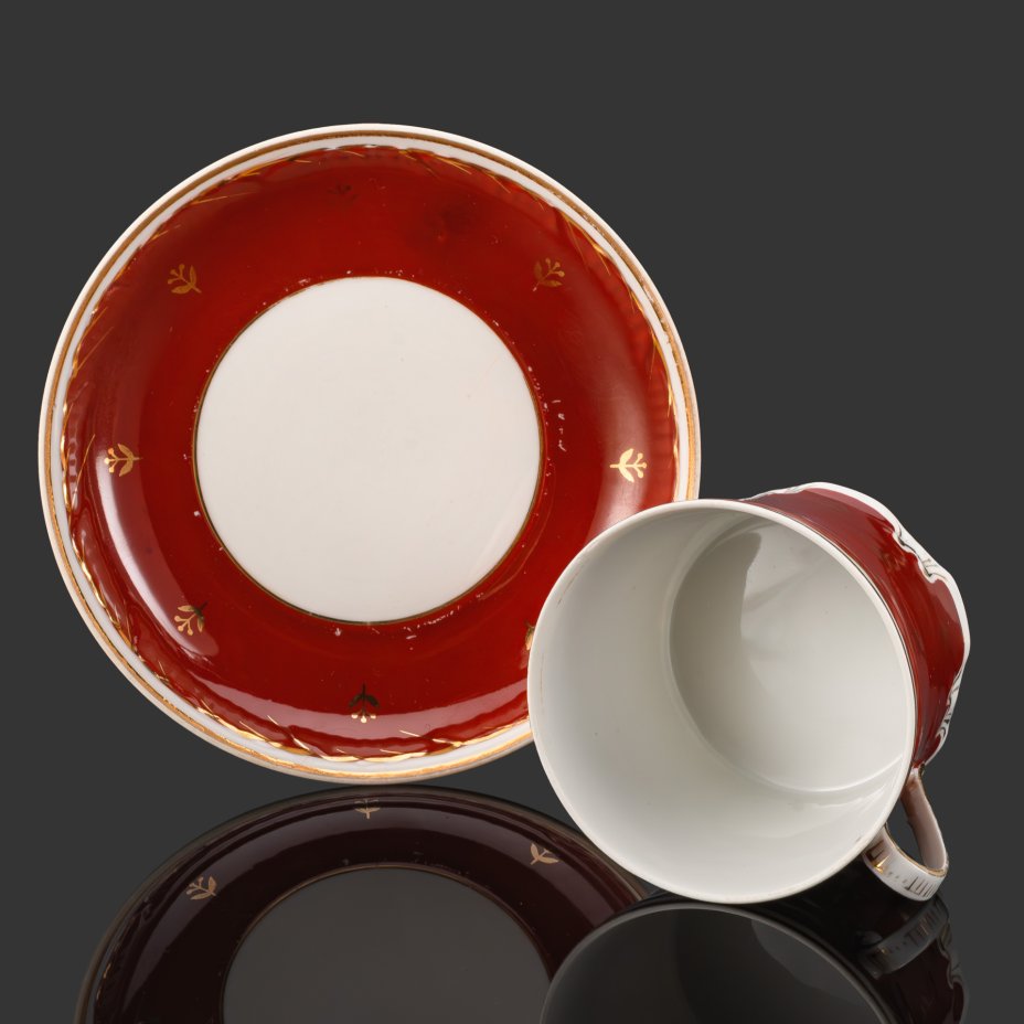 Пара чайная с орнаментальным декором, фаянс, обводка, золочение, Фабрика М.С. Кузнецова в Риге, Латвия, 1920-1930 гг.