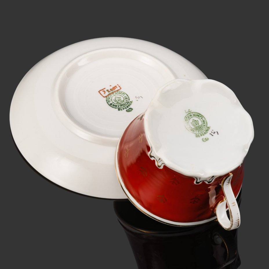 Чайная пара "ВСХВ", фарфор, крытье, золочение, Дмитровский фарфоровый завод (ДФЗ Вербилки), СССР, 1940-1954 гг.