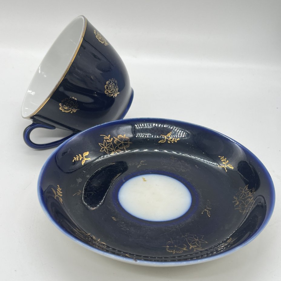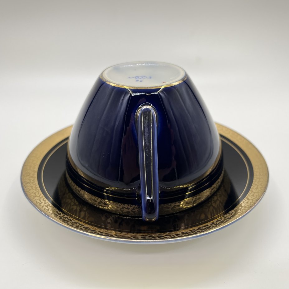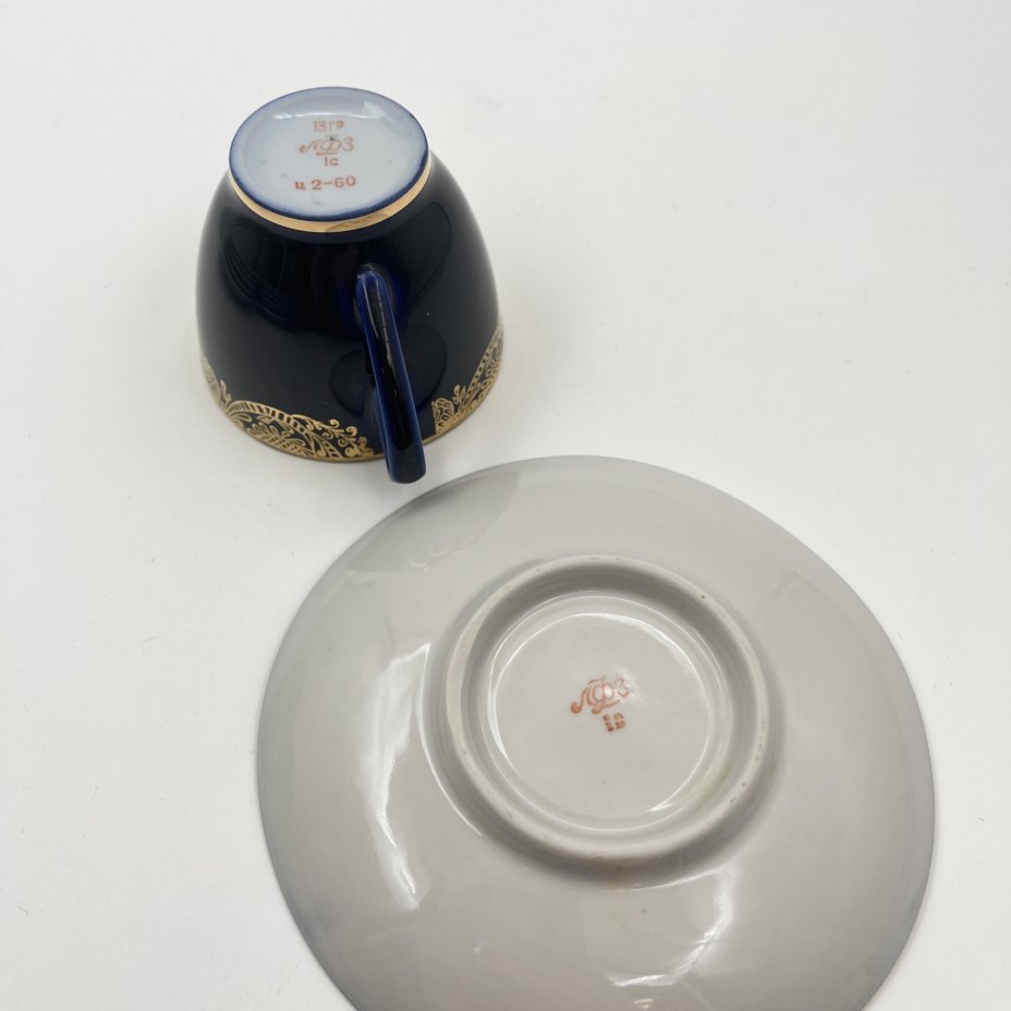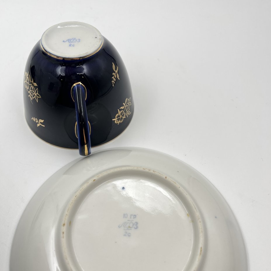 Чайная пара кобальтого оттенка, украшенная растительным декором, фарфор, крытье кобальтом, золочение, Ленинградский фарфоровый завод (ЛФЗ), СССР, 1970-1986 гг.