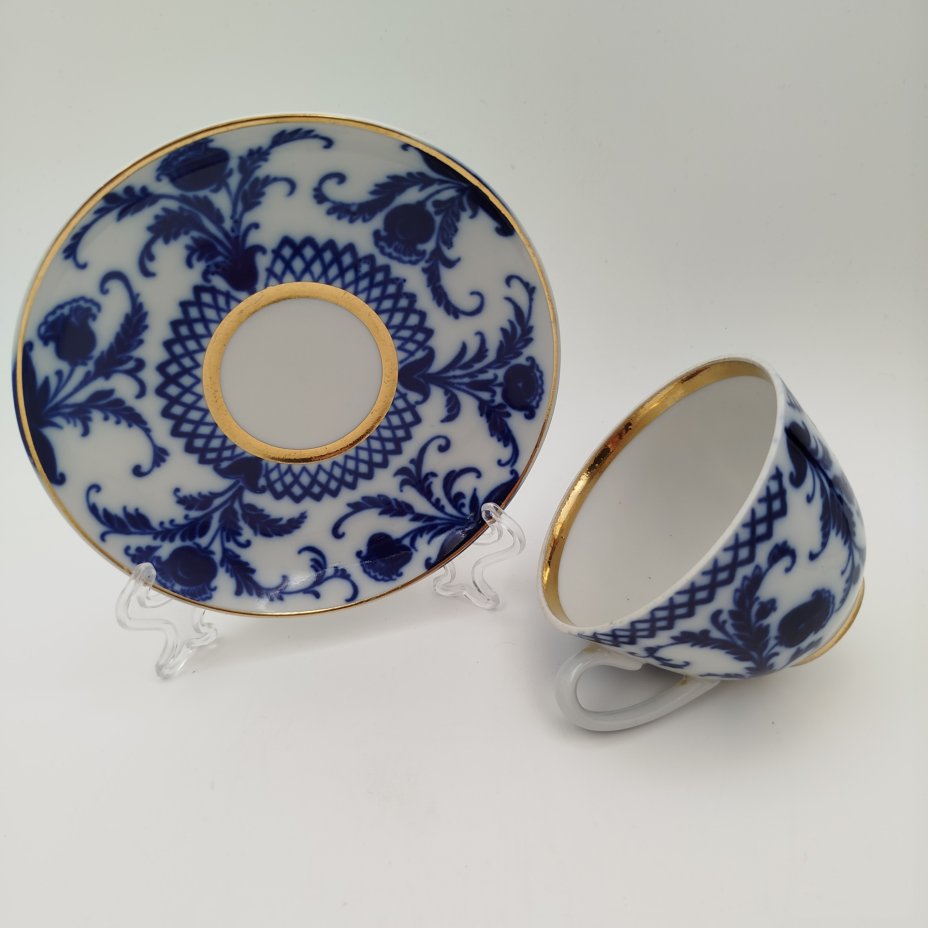 Пара чайная с растительным орнаментом (в подборе), фарфор, крытье кобальтом, золочение, Ленинградский фарфоровый завод (ЛФЗ), СССР, 1960-1970 гг.