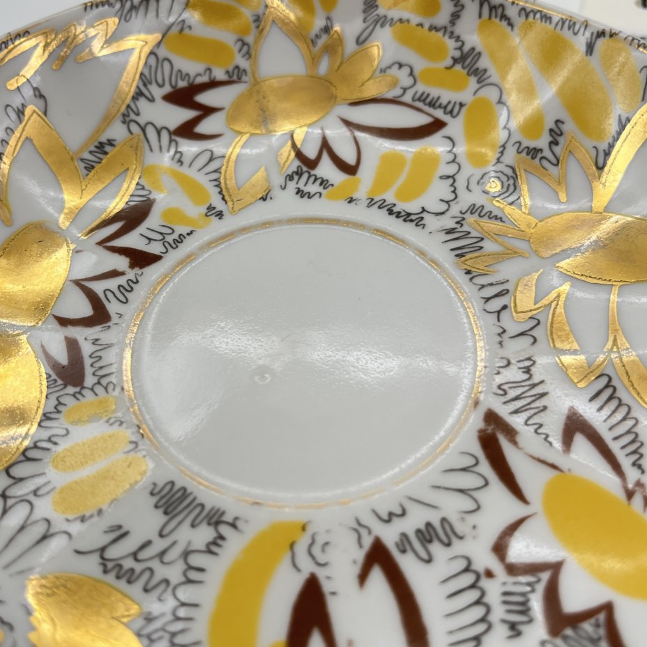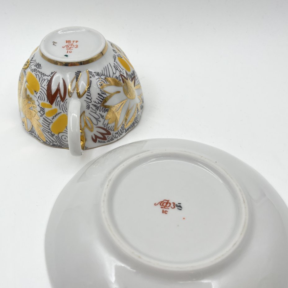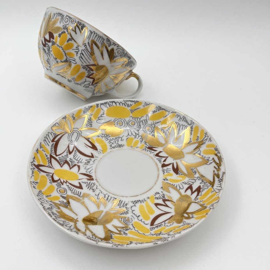 Пара чайная "Золотые ромашки", автор росписи Л.И. Григорьева, форма "Тюльпан", фарфор, деколь, золочение, Ленинградский фарфоровый завод (ЛФЗ), СССР, 1970-1986 гг.