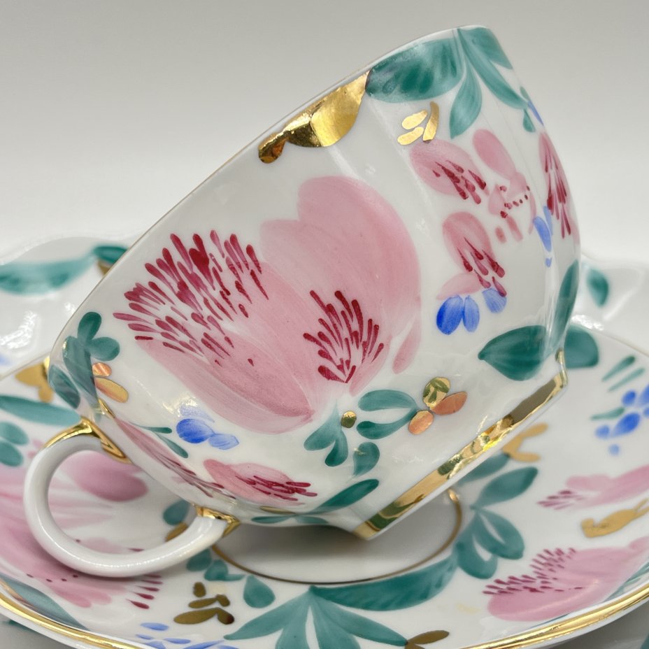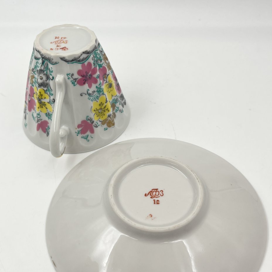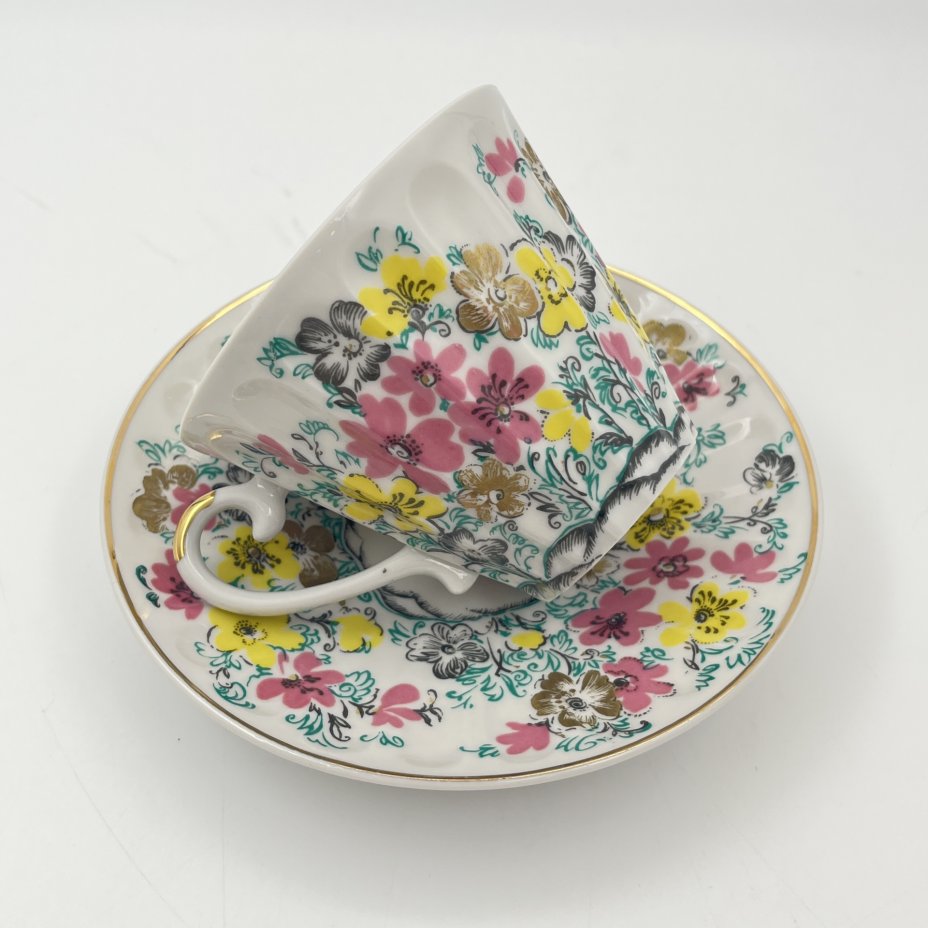 Чайная пара "Ситец", форма "Лучистая", автор формы Н.П. Славина, фарфор, деколь, золочение, Ленинградский фарфоровый завод (ЛФЗ), СССР, 1970-1986 гг.