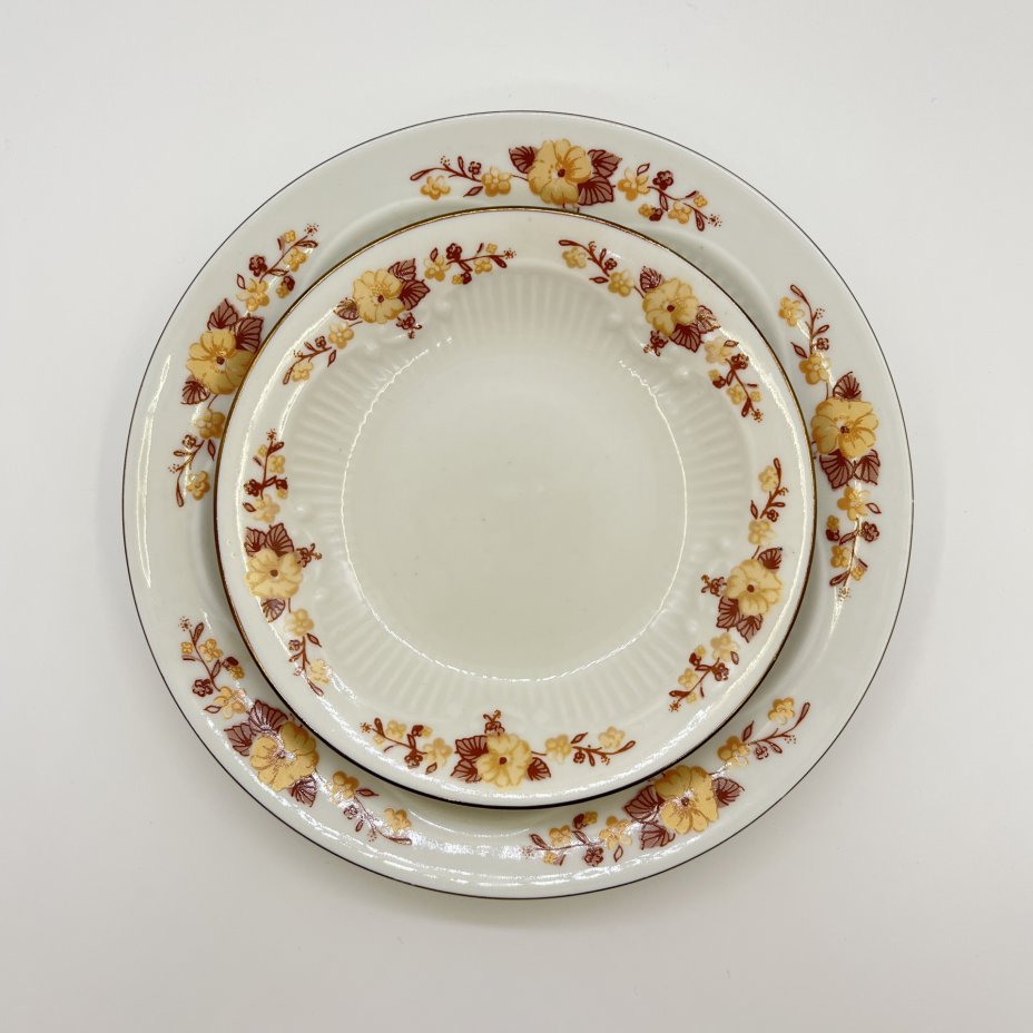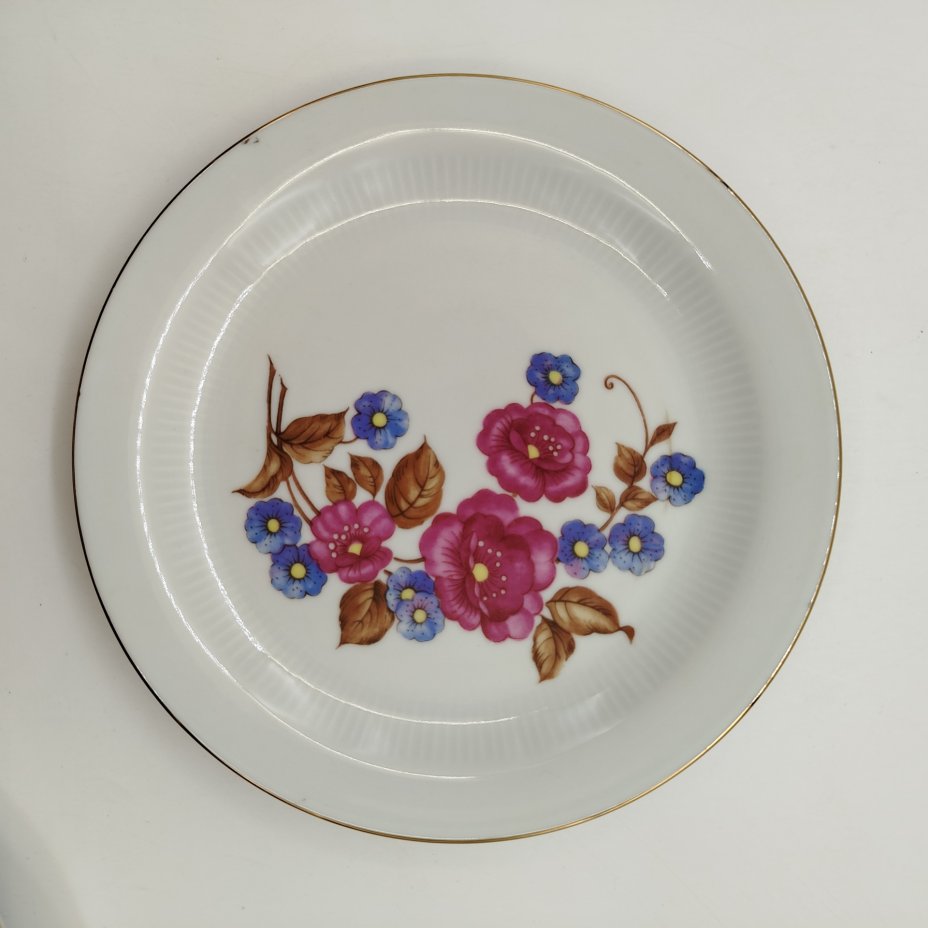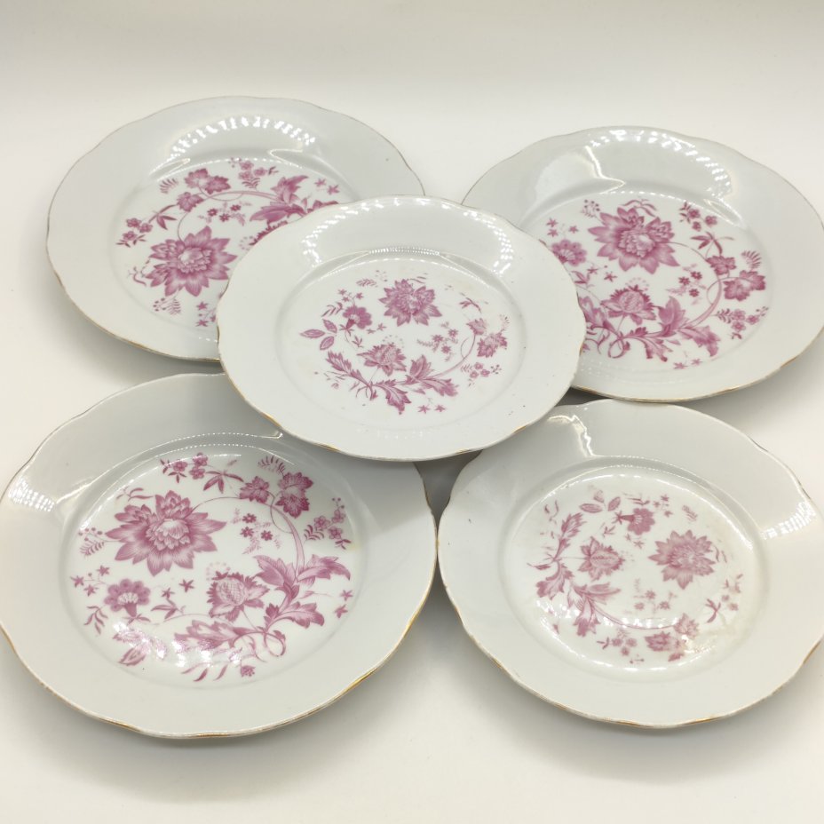Набор из 2-х пирожковых и 3-х десертных тарелок с монохромным цветочным декором, фарфор, деколь, золочение, Colditz (Кольдиц), ГДР, 1950-1980 гг.