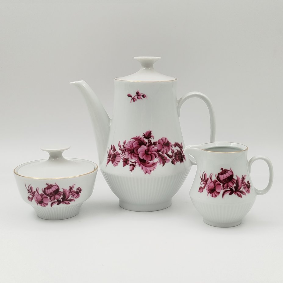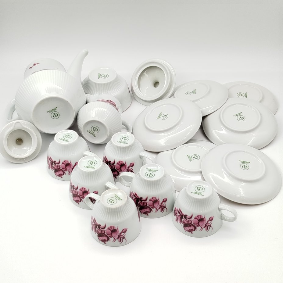 Сервиз кофейный с цветочным декором в пурпурной гамме на 6 персон (15 предметов), фарфор, деколь, золочение, Colditz (Кольдиц), ГДР, 1960-1990 гг.