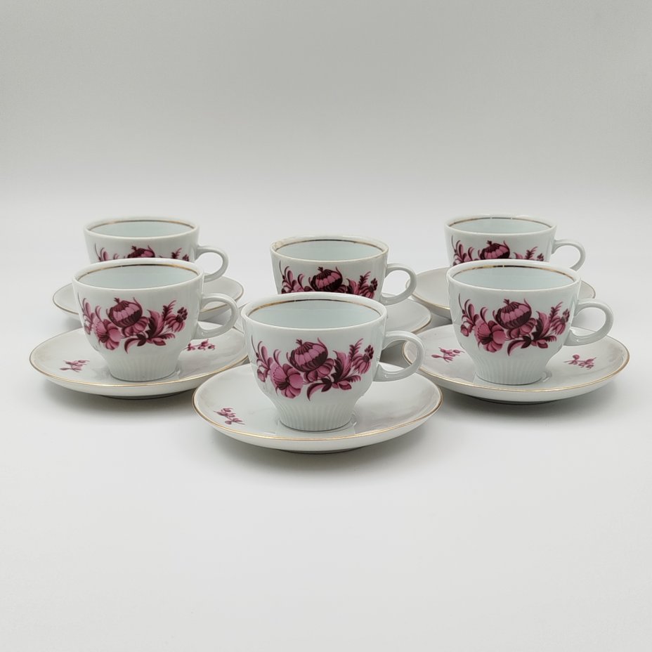 Набор чайно-кофейных пар на 6 персон, украшенных цветочным декором, фарфор, деколь, золочение, Colditz (Кольдиц), Германия, 1980-1990 гг.