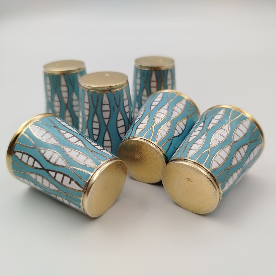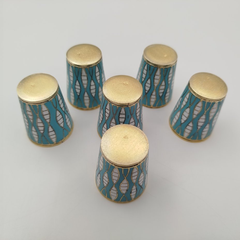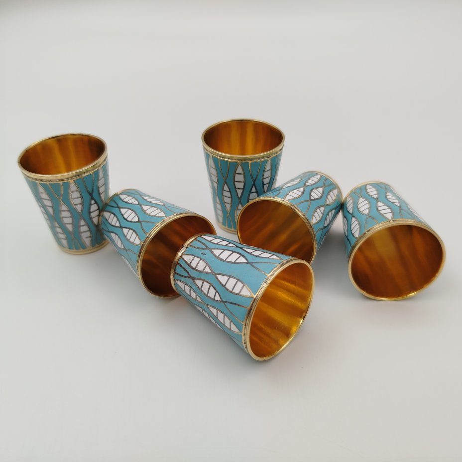 Набор из шести стопок с орнаментом в бело-голубой гамме, мельхиор (медь-никель), золочение, эмаль, Ленинградское производственное объединение «Русские самоцветы», СССР, 1970-1990 гг.