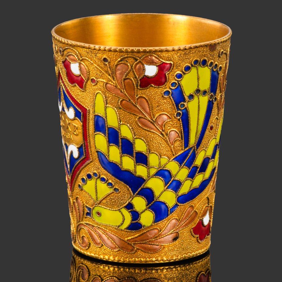 Стопка "ВСХВ Москва" украшенная изображениями птиц в эмалях, металл, эмаль, Ленинградский ювелирный завод, СССР, 1954 г.