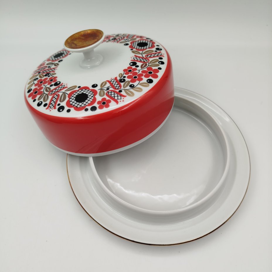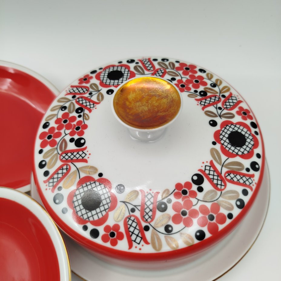 Набор для сервировки на 6 персон (масленка и розетки), выполненный в ярко-красном цвете с флористическим декором, фарфор, крытье, деколь, золочение, Freiberger Porzellan, ГДР, 1970-1990 гг.