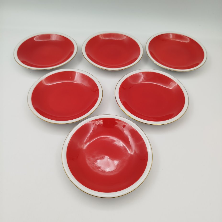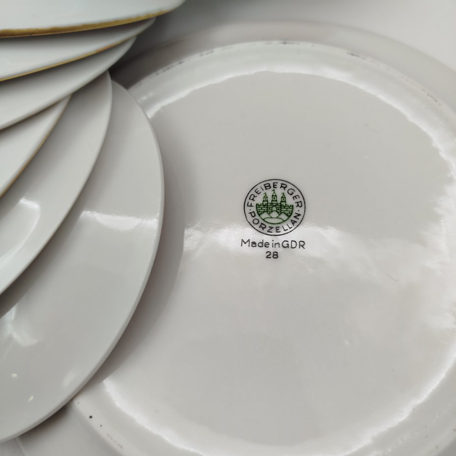 Набор из 6 блюдец с лаконичным декором (в подборе), фарфор, крытье, золочение, Freiberger Porzellan, ГДР, 1950-1980 гг.