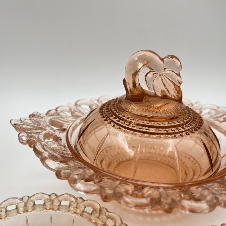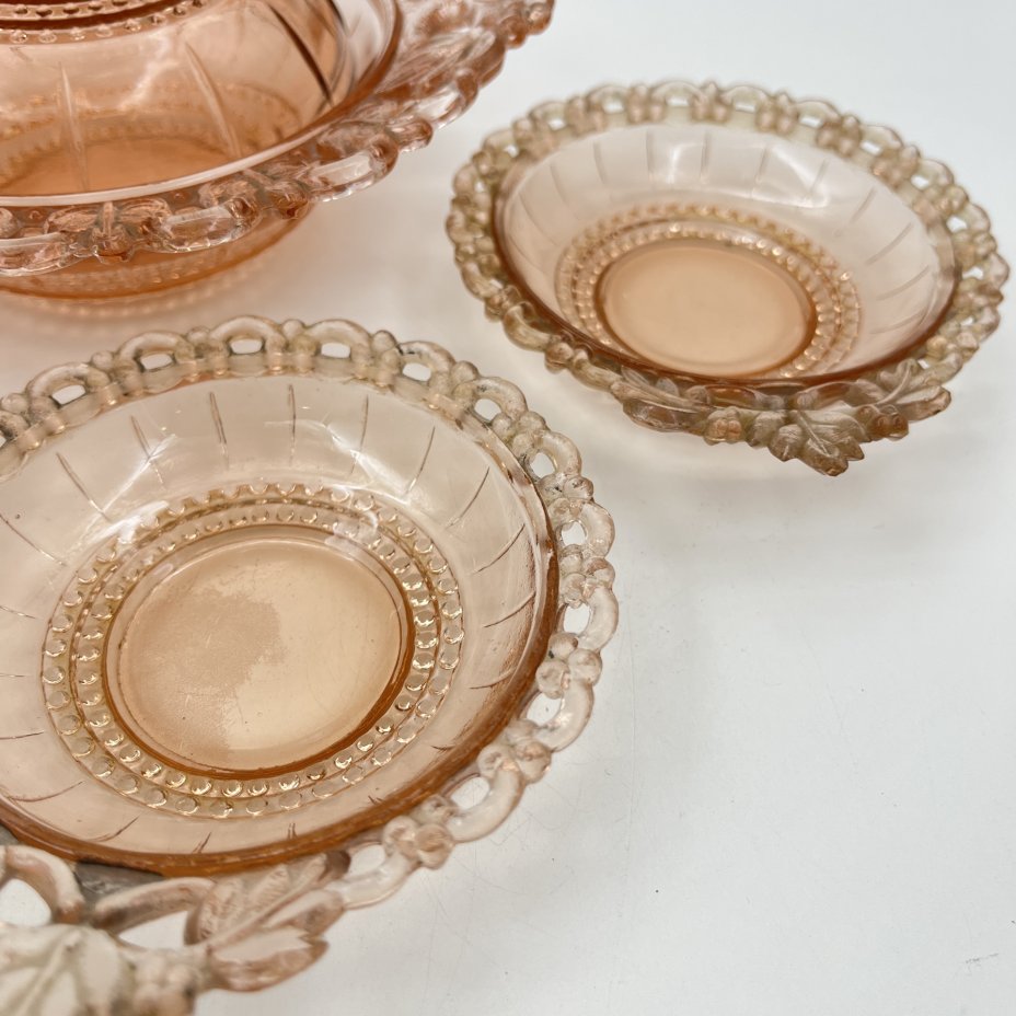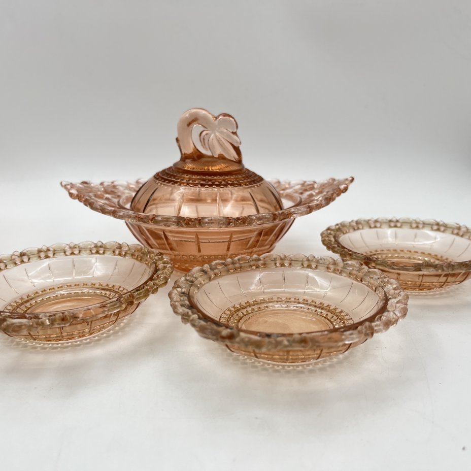 Набор для подачи десерта, состоящий из трех розеток и вазочки карамельного оттенка, стекло, пресс, СССР, 1960-1980 гг.