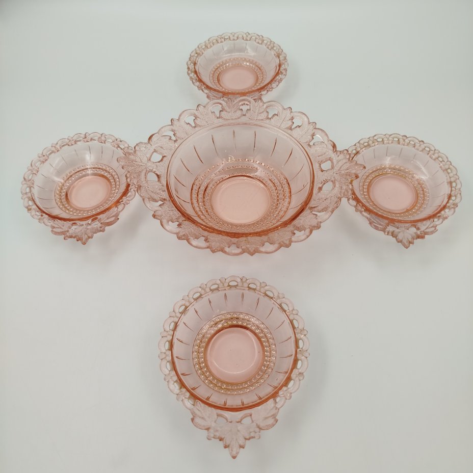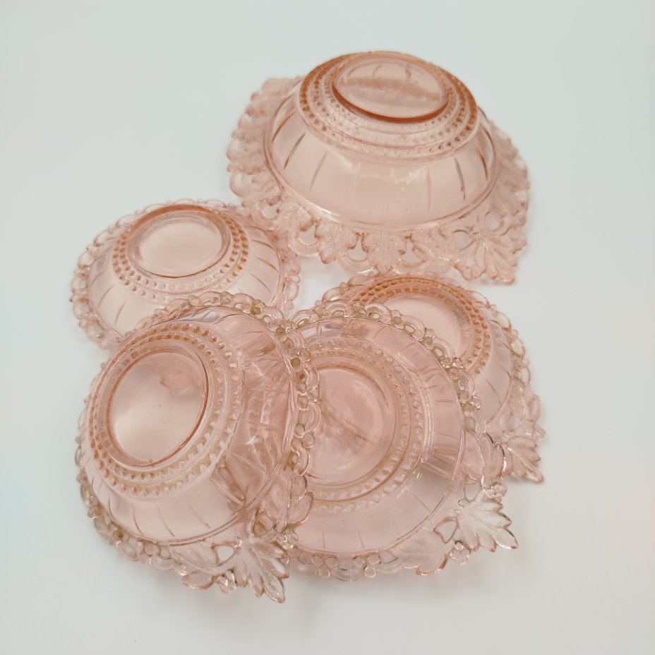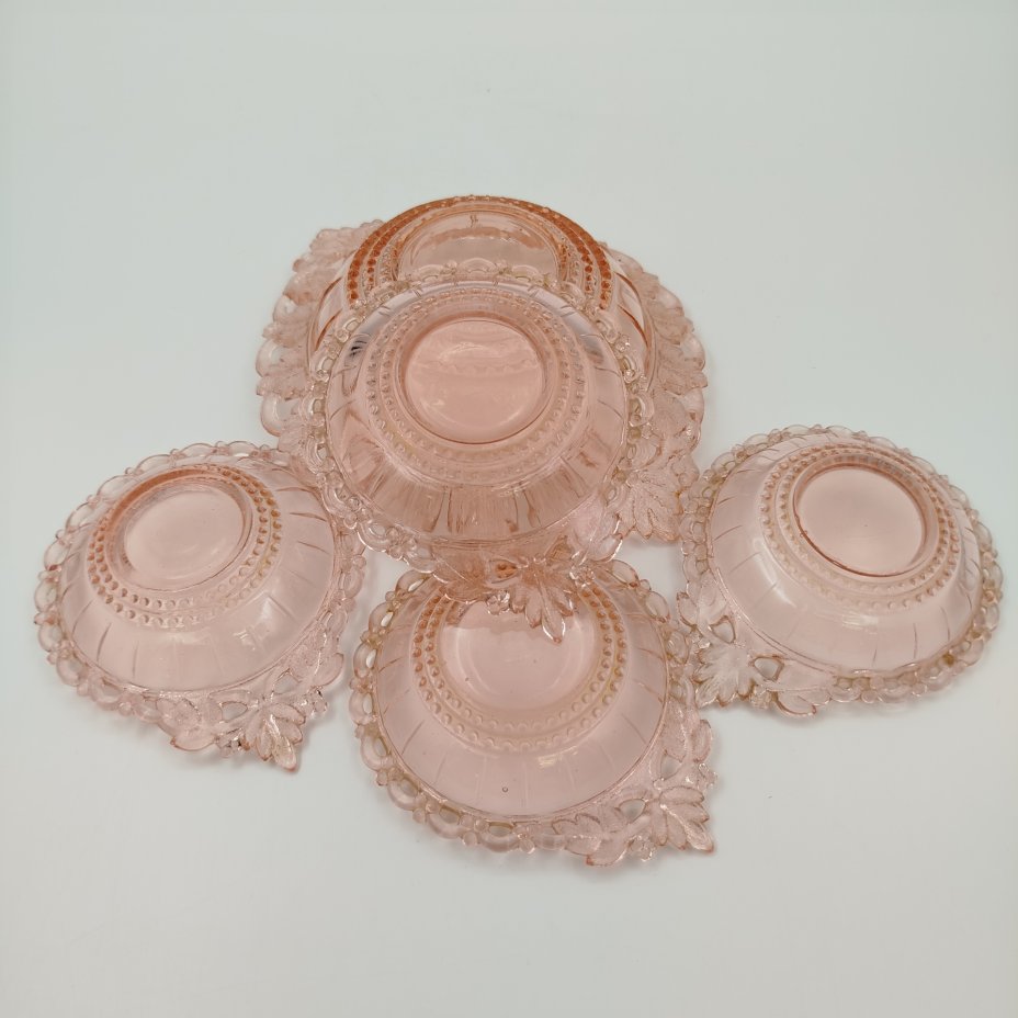 Набор для подачи десерта, состоящий из четырёх розеток и вазочки карамельного оттенка, стекло, пресс, СССР, 1960-1980 гг.