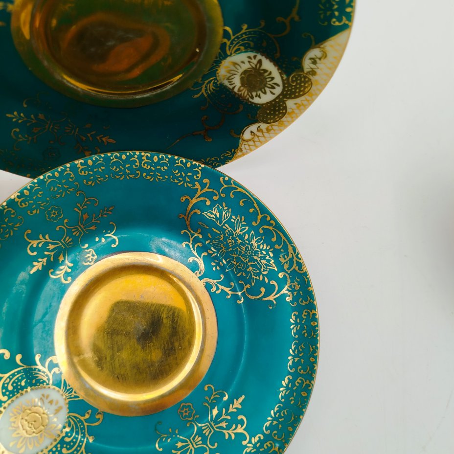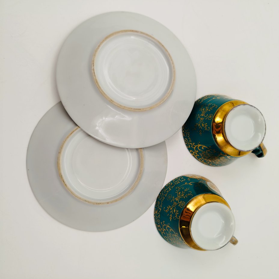 Набор из двух чайных пар зеленого цвета с декором в виде розочек, фарфор, крытье, золочение, Дмитровский фарфоровый завод (ДФЗ Вербилки), СССР, 1954-1965 гг.