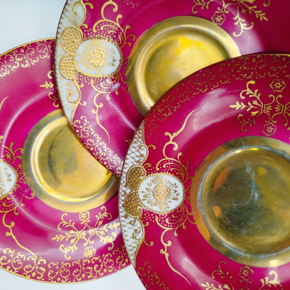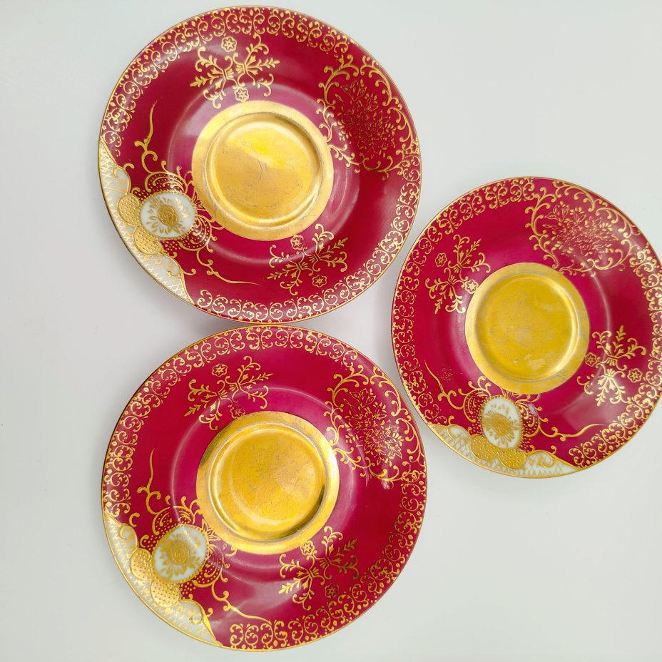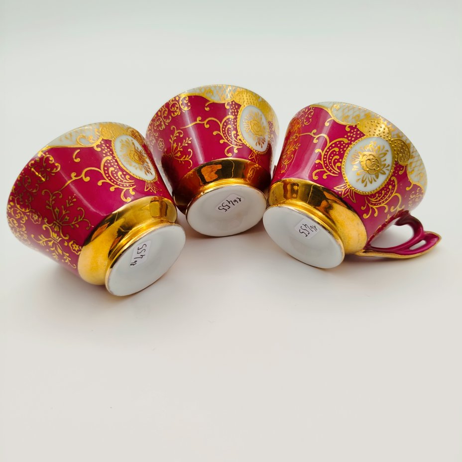 Набор из 3-х кофейных пар бордового оттенка с ажурным декором, фарфор, крытье, золочение, Западная Европа, 1960-1980 гг.