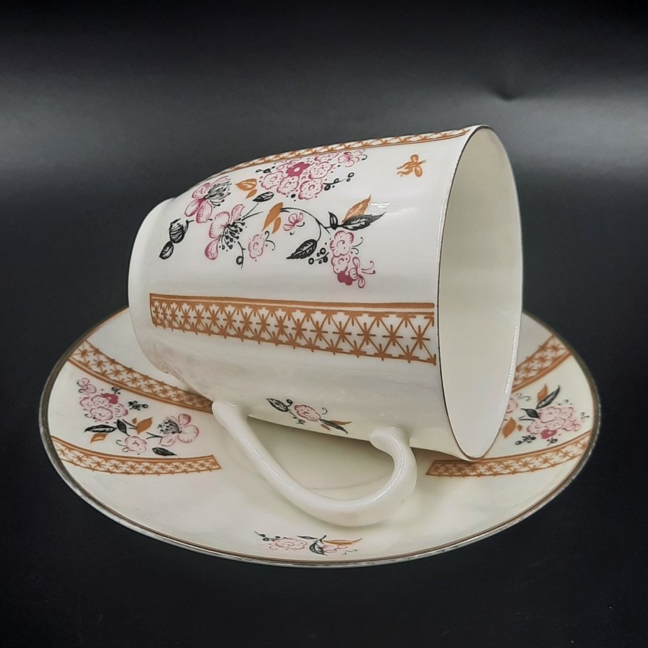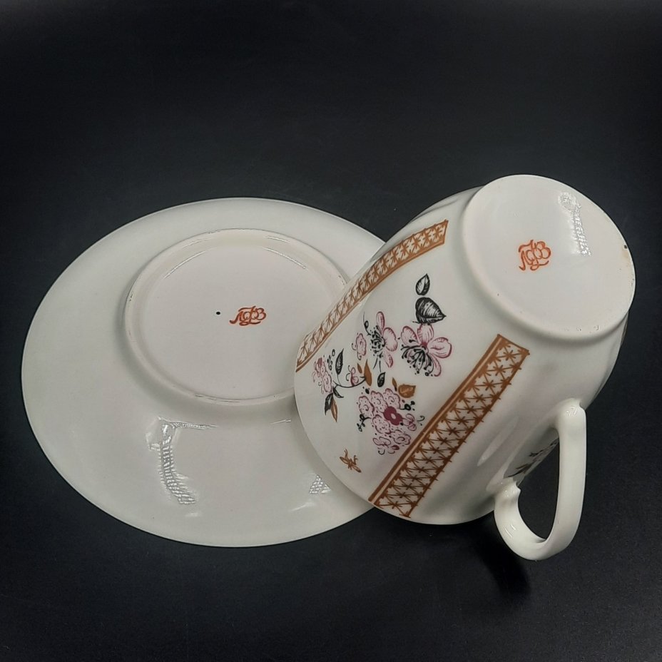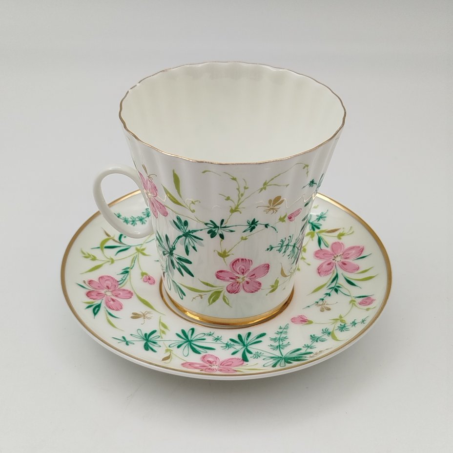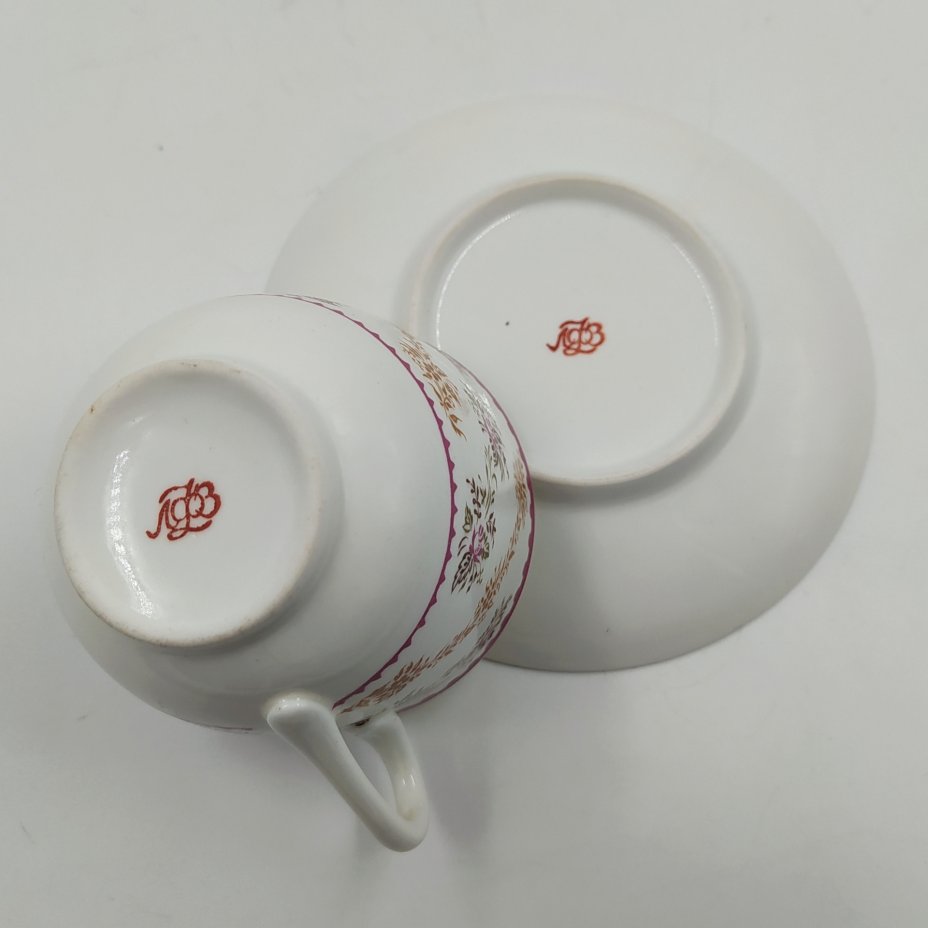 Кофейная пара "Розовые веточки" ("Золотые бабочки"), форма "Майская", автор формы Э.М. Криммер, художник В.Г.Богданов, фарфор, деколь, Ленинградский фарфоровый завод (ЛФЗ), СССР, 1970-1986 гг.