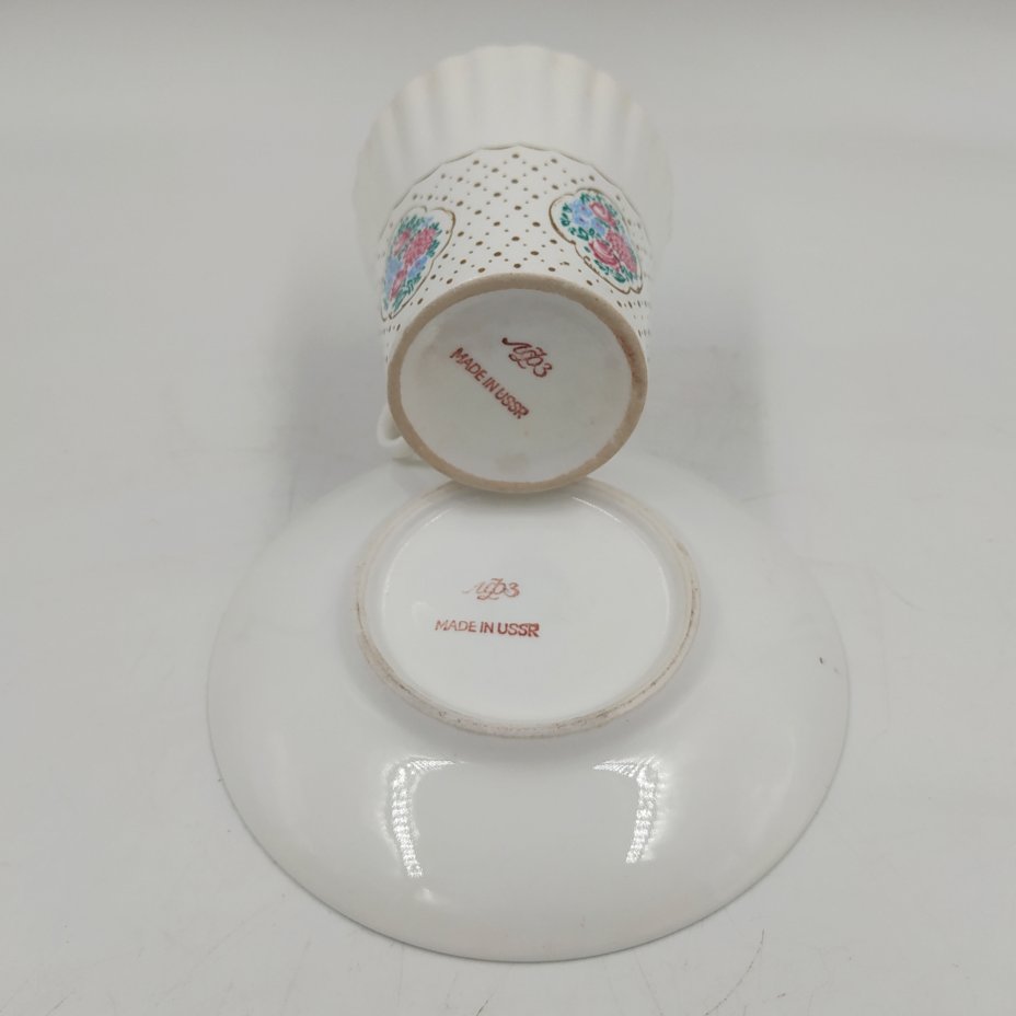 Пара кофейная с цветочным декором в резервах (форма "Одуванчик"), фарфор, деколь, золочение, Ленинградский фарфоровый завод (ЛФЗ), СССР, 1970-1992 гг.