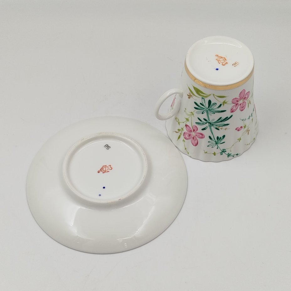 Пара кофейная с растительным декором, (форма "Одуванчик"), фарфор, деколь, Ленинградский фарфоровый завод (ЛФЗ), СССР, 1970-1992 гг.
