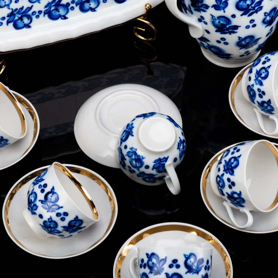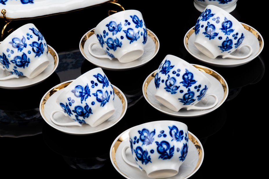 Сервиз чайный с декором в виде синих цветов на 5 персон (14 предметов), автор формы "Стандарт" Шобанов А.И., автор росписи Лосев В.Н., фарфор, роспись, золочение, Дмитровский фарфоровый завод (ДФЗ Вербилки), СССР, 1950 г.