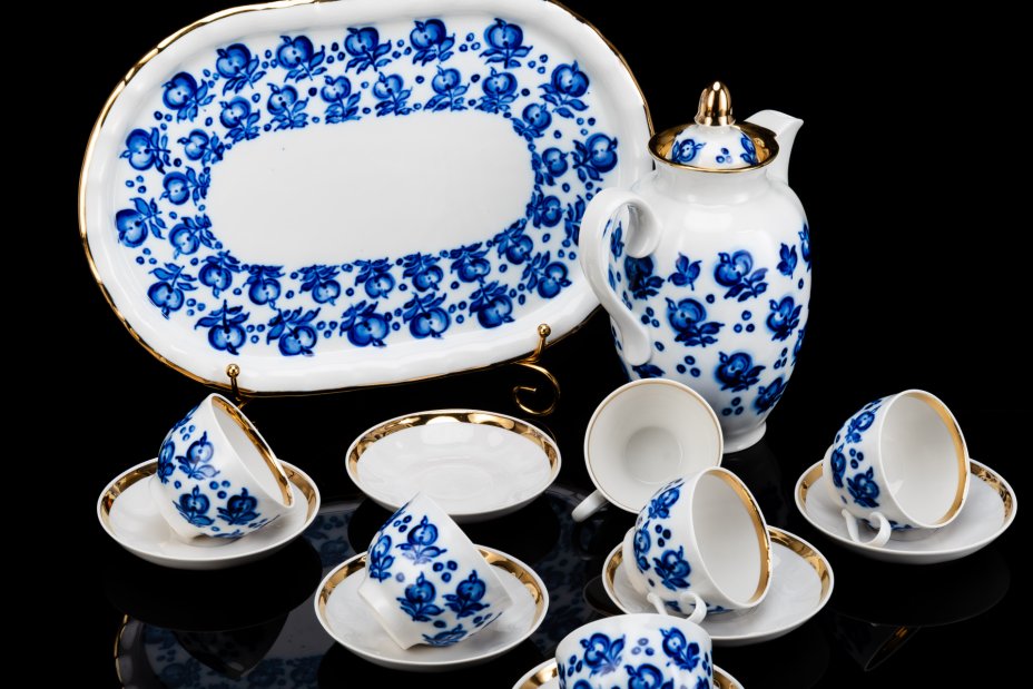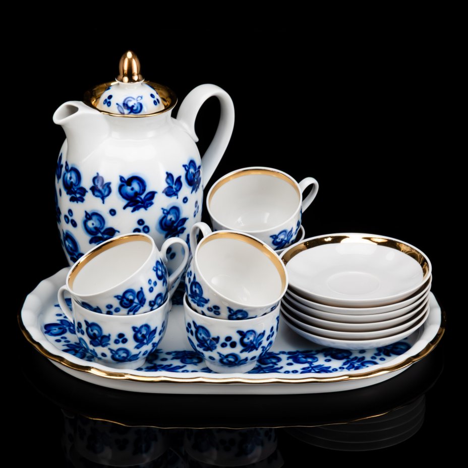 Сервиз кофейный на 6 персон (15 предметов), украшенный цветочнм декором, фарфор, крытье кобальтом, золочение, Полонский фарфоровый завод, СССР, 1980-1991 гг.