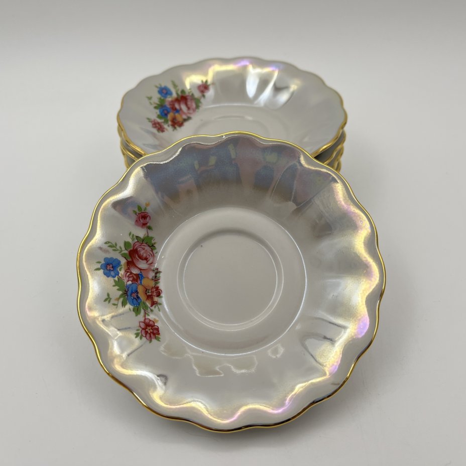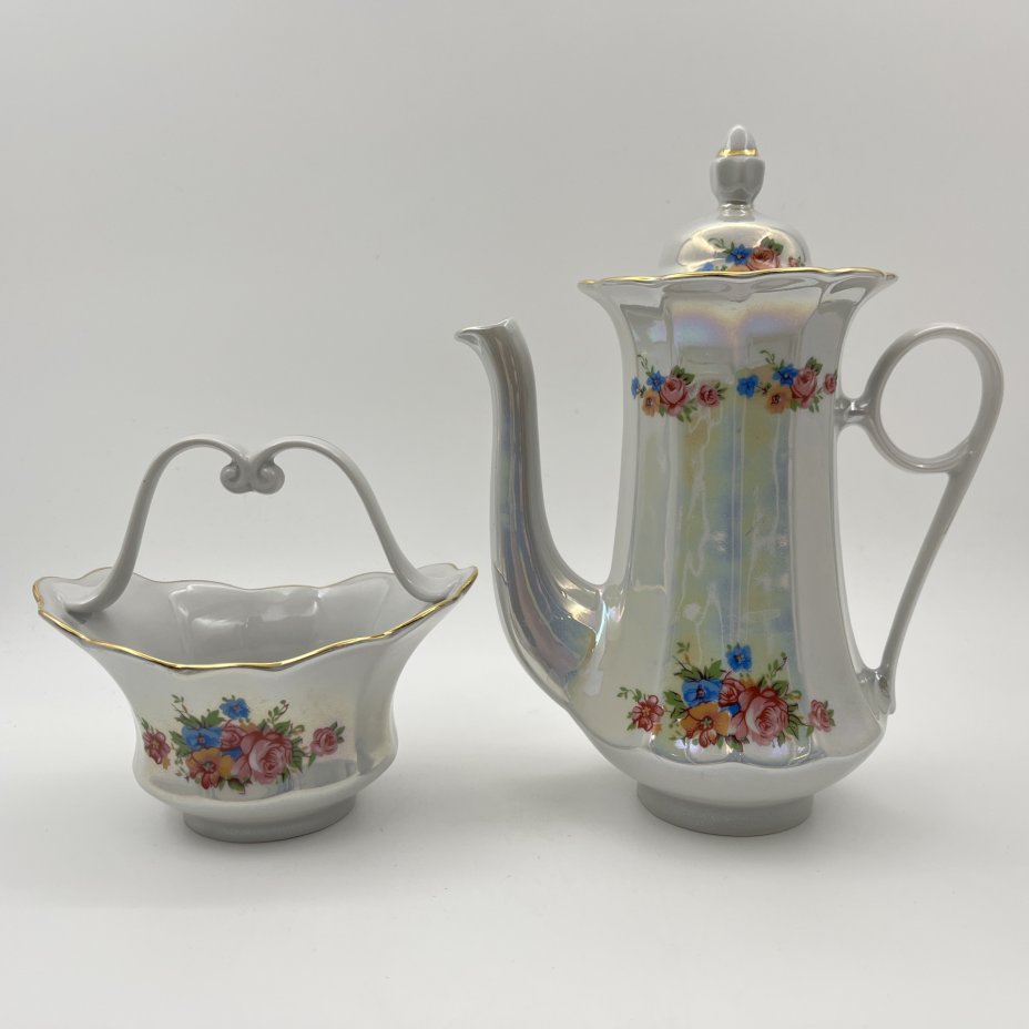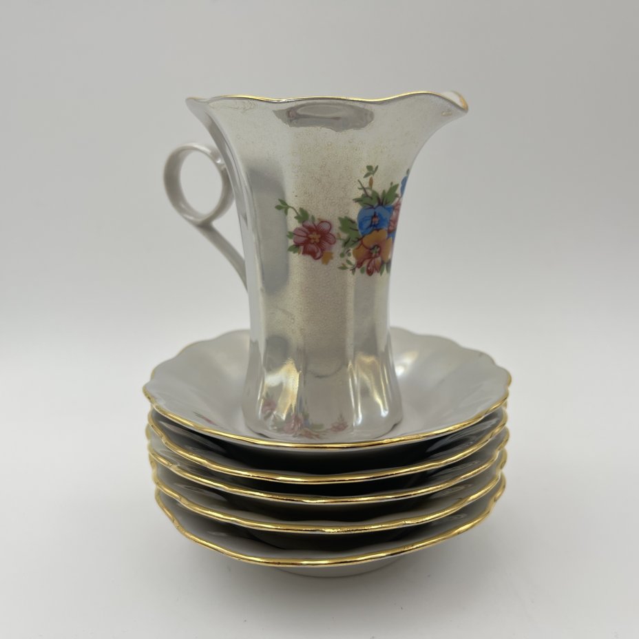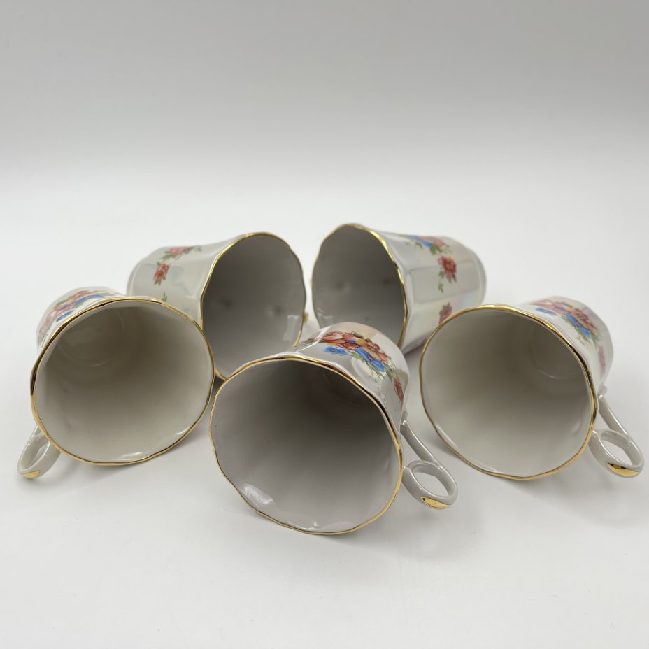 Сервиз кофейный на 5 персон, украшенный цветочным декором (13 предметов), фарфор, деколь, люстр, Коростенский фарфоровый завод (КФЗ), СССР, 1970-1990 гг.