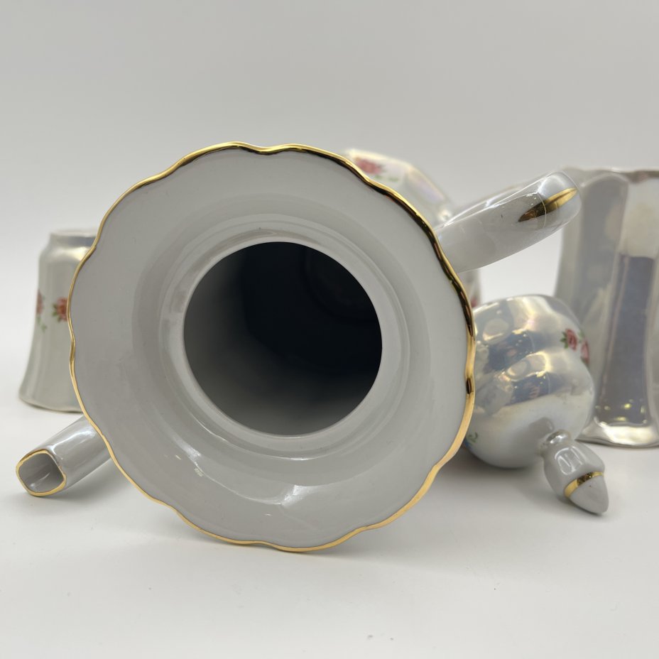Сервиз чайный "Жемчужный" на 6 персон (15 предметов), автор формы "Весенняя" Яковлева С.Е., автор рисунка Семенова А.Н., фарфор, люстр, деколь, золочение, Ленинградский фарфоровый завод (ЛФЗ), СССР, 1970-1986 гг.
