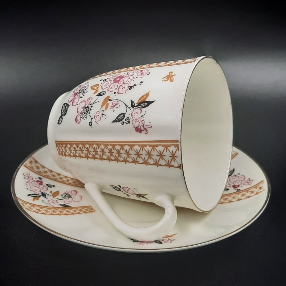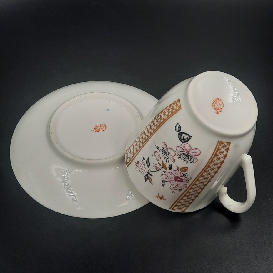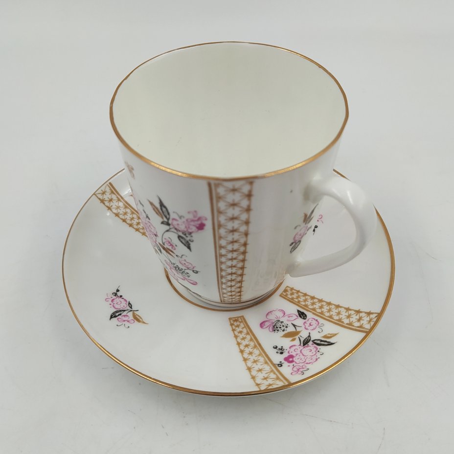 Кофейная пара "Розовые веточки" ("Золотые бабочки"), форма "Майская", автор формы Э.М. Криммер, художник В.Г.Богданов, фарфор, деколь, Ленинградский фарфоровый завод (ЛФЗ), СССР, 1970-1986 гг.
