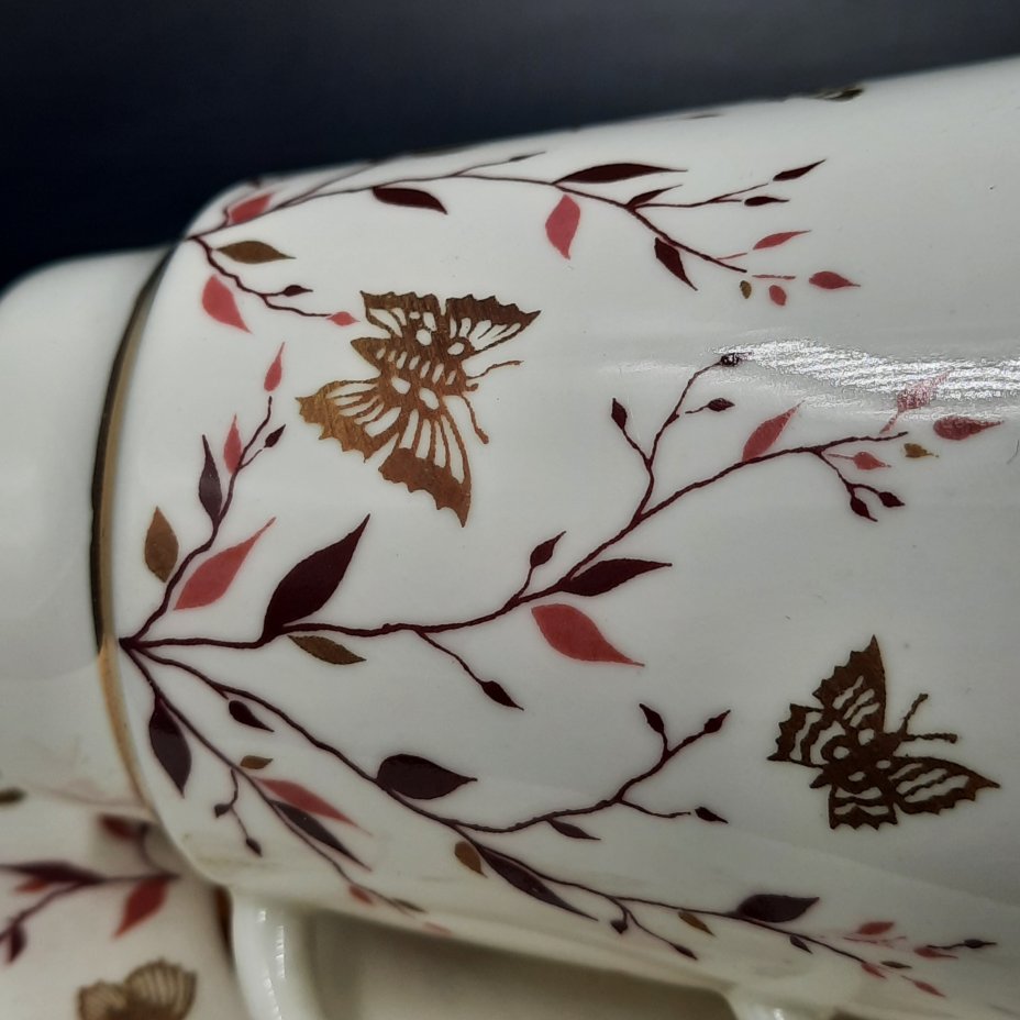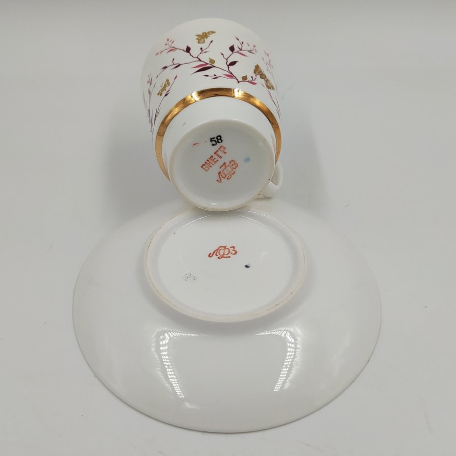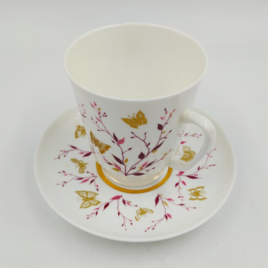 Пара кофейная "Розовые веточки" ("Золотые бабочки"), форма "Майская", автор формы Э.М. Криммер, автор рисунка В.Г. Богданов, фарфор, деколь, золочение, Ленинградский фарфоровый завод (ЛФЗ), СССР, 1970-1992 гг.