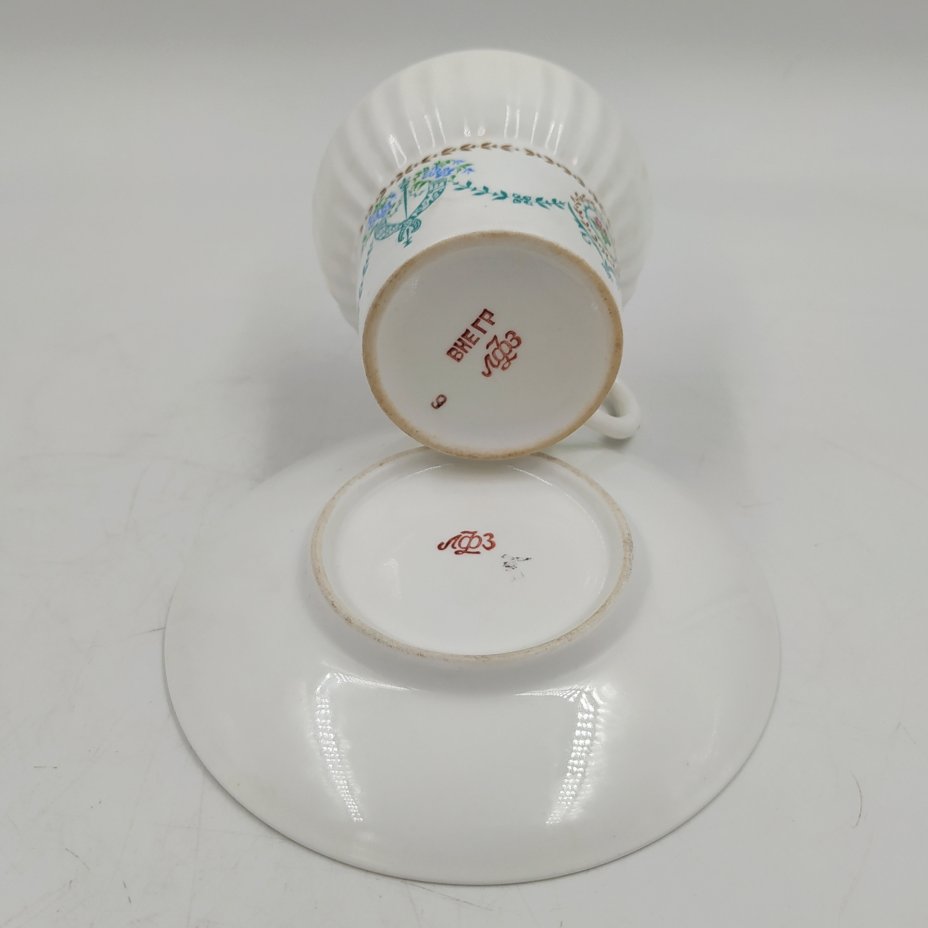 Пара кофейная с декором в виде гирлянд (форма "Волна"), фарфор, деколь, Ленинградский фарфоровый завод (ЛФЗ), СССР, 1970-1992 гг.