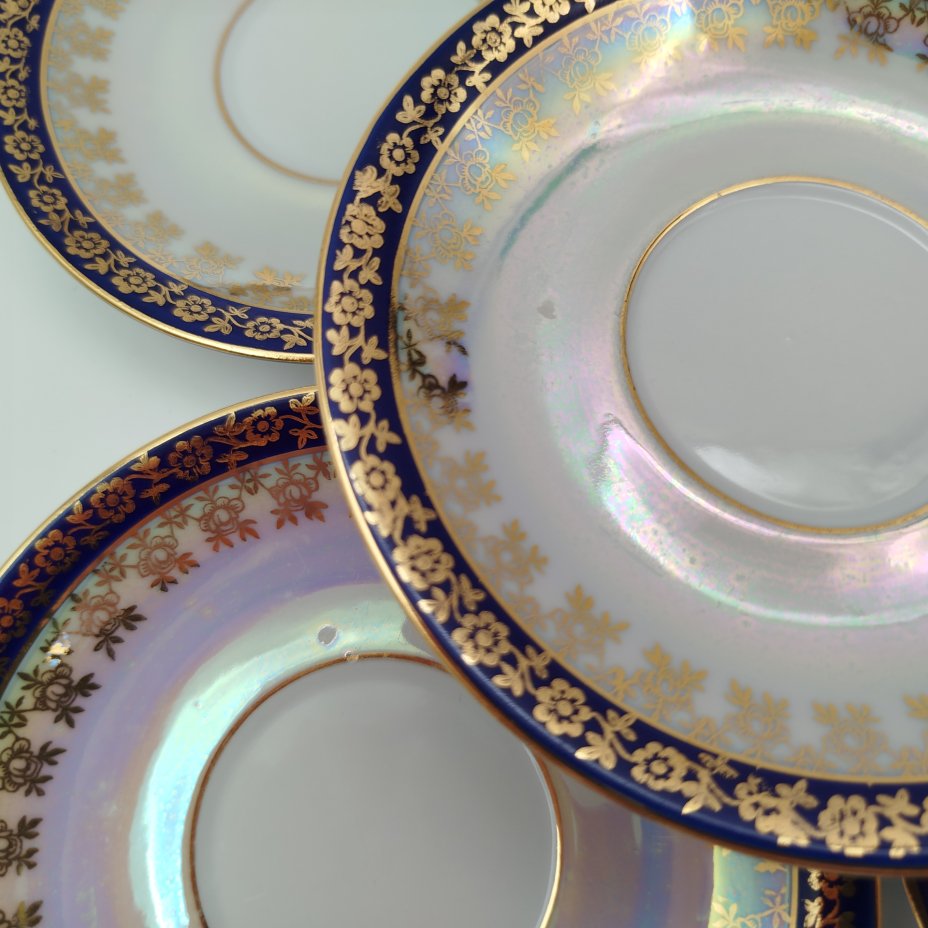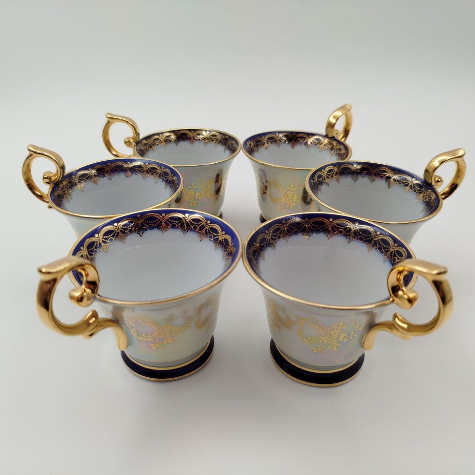 Набор кофейных пар с растительным декором золотого цвета и кобальтовым кантом на 6 персон, фарфор, люстр, золочение, Martinroda Friedrich Eger & Co. (PM), Германия, 1960-1980 гг.