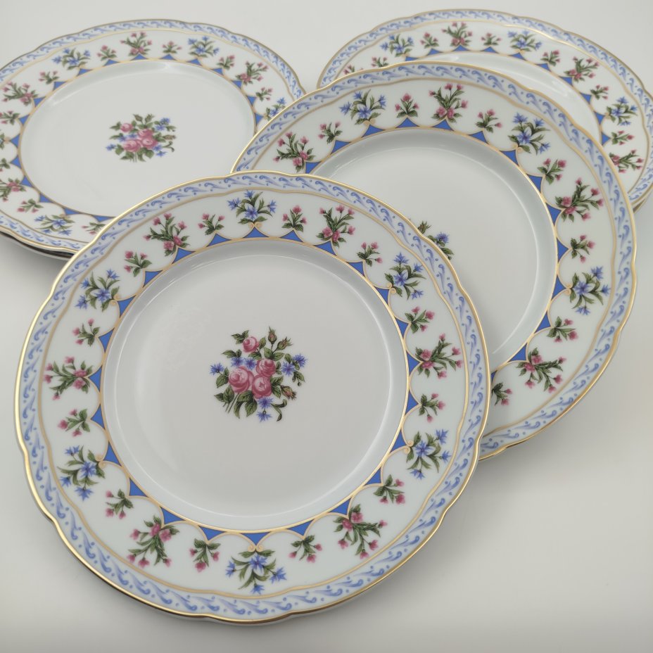 Набор из четырех обеденных тарелок с цветочным декором, фаянс, роспись, деколь, Sarreguemines, Франция, 1918-1930 гг.