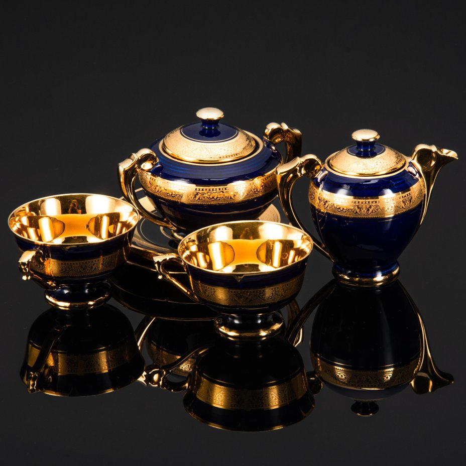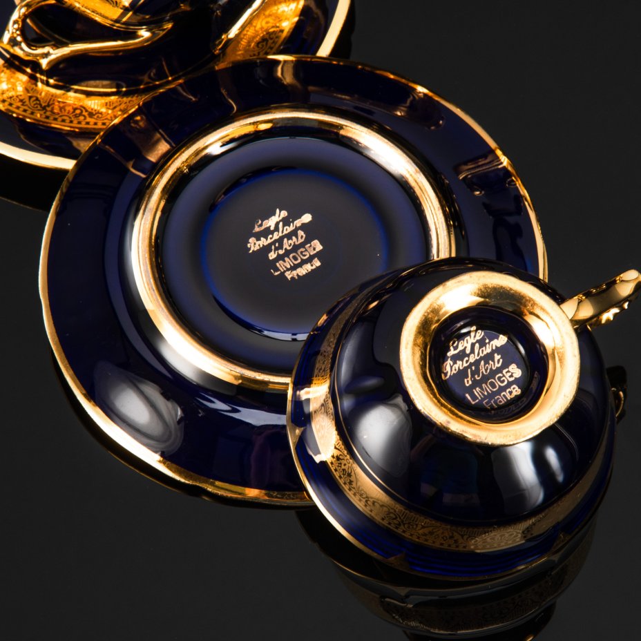 Кофейный набор тет-а-тет кобальто-золотистого оттенка, фарфор, золочение, Limoges, Франция, 1950-1970 гг.
